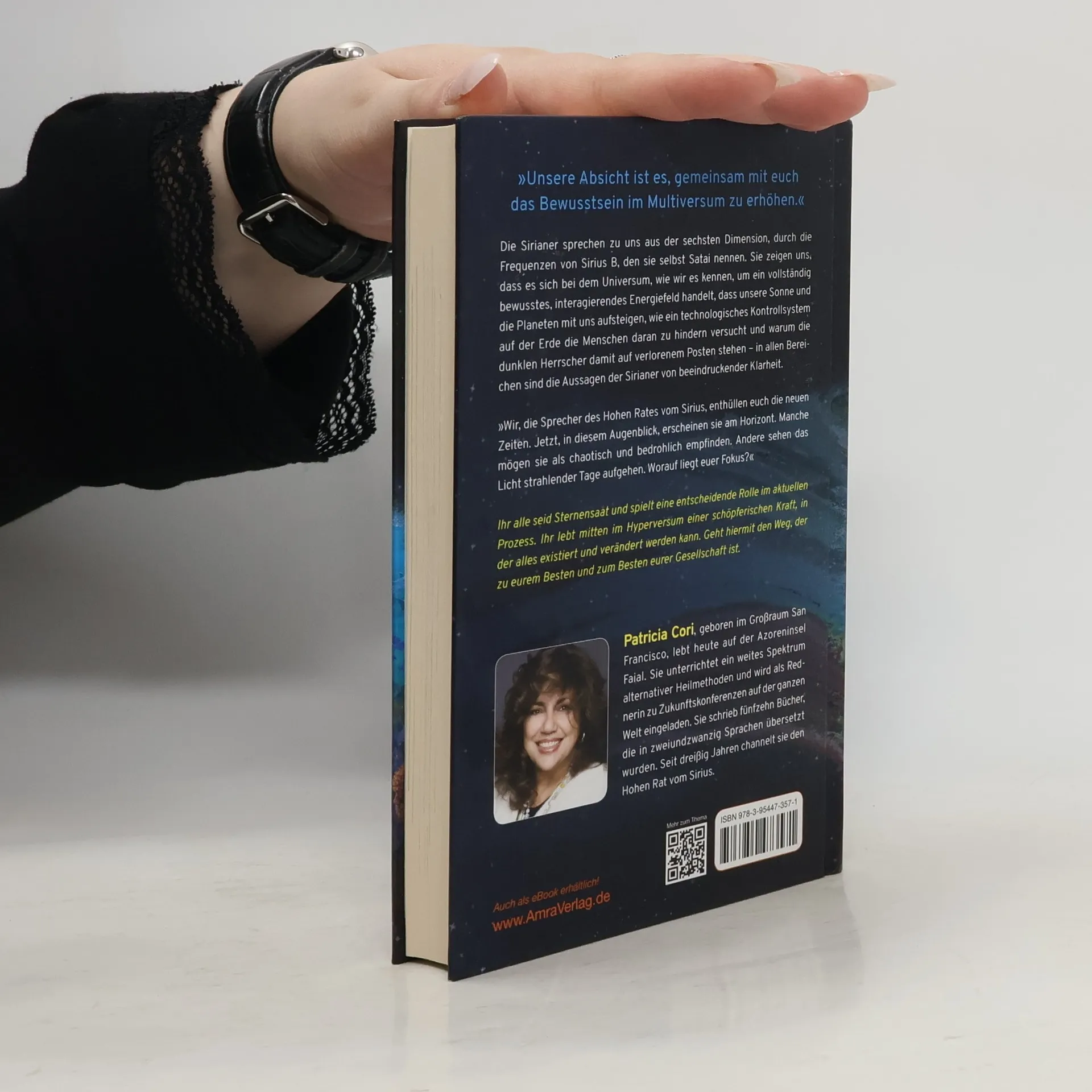 "Unsere Absicht ist es, gemeinsam mit euch das Bewusstsein im Multiversum zu erhöhen." Die Sirianer sprechen zu uns aus der sechsten Dimension, durch die Frequenzen von Sirius B, den sie selbst Satai nennen. Sie zeigen uns, dass es sich bei dem Universum, wie wir es kennen, um ein vollständig bewusstes, interagierendes Energiefeld handelt, dass unsere Sonne und die Planeten mit uns aufsteigen, wie ein technologisches Kontrollsystem auf der Erde die Menschen daran zu hindern versucht und warum die dunklen Herrscher damit auf verlorenem Posten stehen – in allen Bereichen sind die Aussagen der Sirianer von beeindruckender Klarheit. "Wir, die Sprecher des Hohen Rates vom Sirius, enthüllen euch die neuen Zeiten. Jetzt, in diesem Augenblick, erscheinen sie am Horizont. Manche mögen sie als chaotisch und bedrohlich empfinden. Andere sehen das Licht strahlender Tage vor sich aufgehen. Worauf liegt euer Fokus?" Ihr alle seid Sternensaat und spielt eine entscheidende Rolle im aktuellen Prozess. Ihr lebt mitten im Hyperversum einer schöpferischen Kraft, in der alles existiert und verändert werden kann. Geht hiermit den Weg, der zu eurem Besten und zum Besten eurer Gesellschaft ist. Patricia Cori, geboren im Großraum San Francisco, lebt heute auf der Azoreninsel Faial. Sie unterrichtet ein weites Spektrum alternativer Heilmethoden und wird als Rednerin zu Zukunftskongressen auf der ganzen Welt eingeladen. Sie schrieb fünfzehn Bücher, die in 22 Sprachen übersetzt wurden. Seit 30 Jahren channelt sie den Hohen Rat vom Sirius.