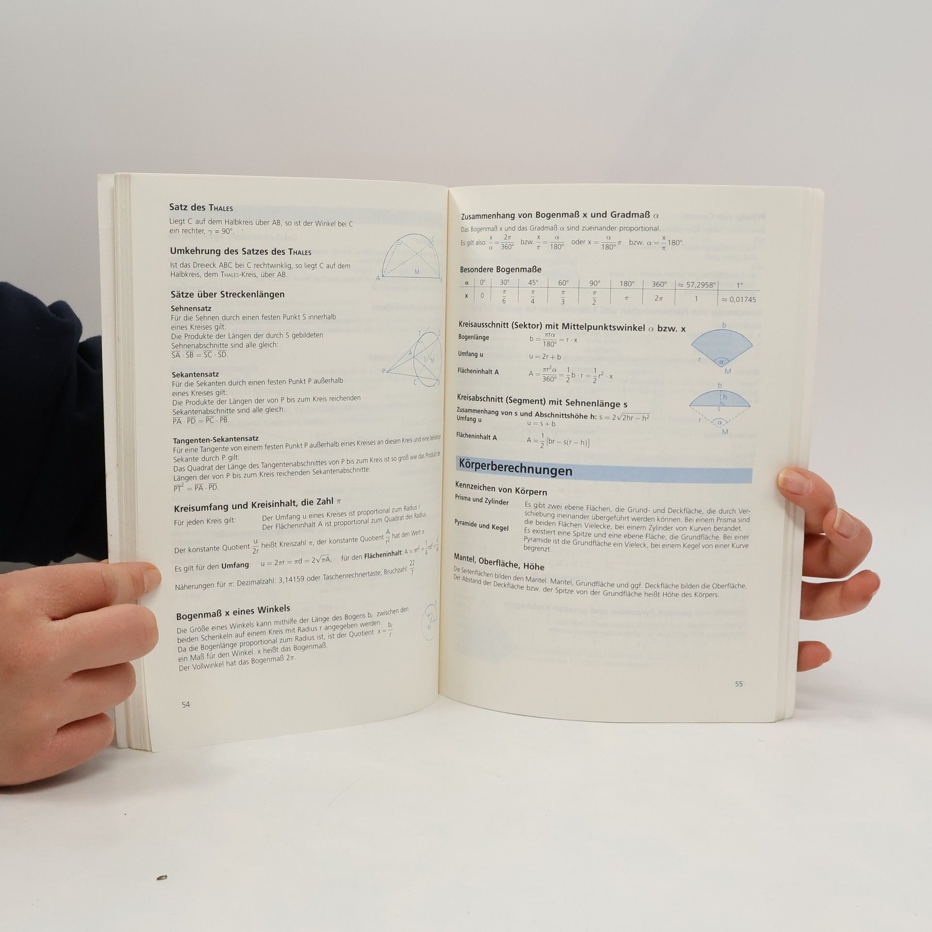 Diese Formelsammlung ist übersichtlich und optisch ansprechend gestaltet (Zweifarbendruck mit vielen Tabellen und Grafiken). Sie enthält alle notwendigen sowie viele zusätzliche Informationen, z. B. das griechische Alphabet, die römischen Zahlen und einen Anhang zur Physik. Angefangen von Grundlagen wie Zahlenbereiche und Rechengesetze bis hin zu Vektor- und Wahrscheinlichkeitsrechnung ist diese Sammlung ideal zum Nachschlagen und für die Aufarbeitung von Wissen. Weitere Themenbereiche Zahlendarstellung, Wurzeln und Logarithmen, Prozentrechnung und Zinsrechnung, komplexe Zahlen, Mengen, Aussagen und Wahrheitswerte, Gleichungen und Ungleichungen, Folgen und Reihen, Funktionen (Grundbegriffe, Verkettung, Umkehrfunktion; Grenzwert, Differenzierbarkeit und Stetigkeit; Bestimmung von Grenzwerten; Sätze über stetige oder differenzierbare Funktionen; Polstellen, Asymptoten, Näherungsfunktionen; Symmetrie, gemeinsame Punkte, Tangente, Normale; Monotonie, Extrempunkte; Krümmung,Wendepunkte), Integralrechnung, Wachstumsvorgänge, Differentialgleichungen, Geometrie (Punkt, Gerade, Strecke, Winkel; Dreiecke; Abbildungen in der Punktebene; Vierecke; regelmäßige Vielecke; Kreis und Kreisteile; Körperberechnungen), Trigonometrie, affiner Punktraum (Geraden, Ebenen und Kugeln; Abstände und Winkel; zweidimensionaler Raum), lineare Gleichungssysteme und mehrstufige Prozesse.