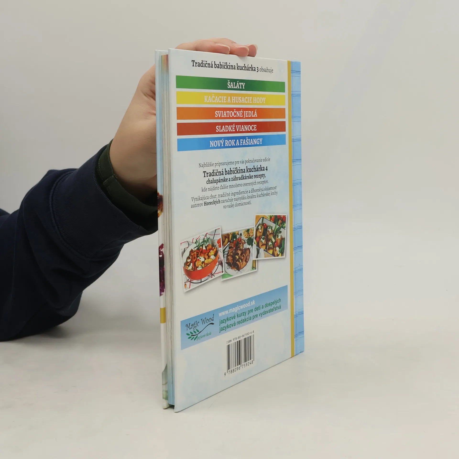 Kačacie a husacie hody, Vianoce, Veľká noc a Fašiangy. Kniha manželov Horeckých obsahuje najlepšie recepty kačacích a husacích hodov s rôznymi tradičnými prílohami, recepty sviatočných jedál - šaláty, polievky, hlavné jedla z mäsa a rýb, tradičné vianočné múčniky a recepty pre Nový rok a Fašiangy. Dobrú chuť.