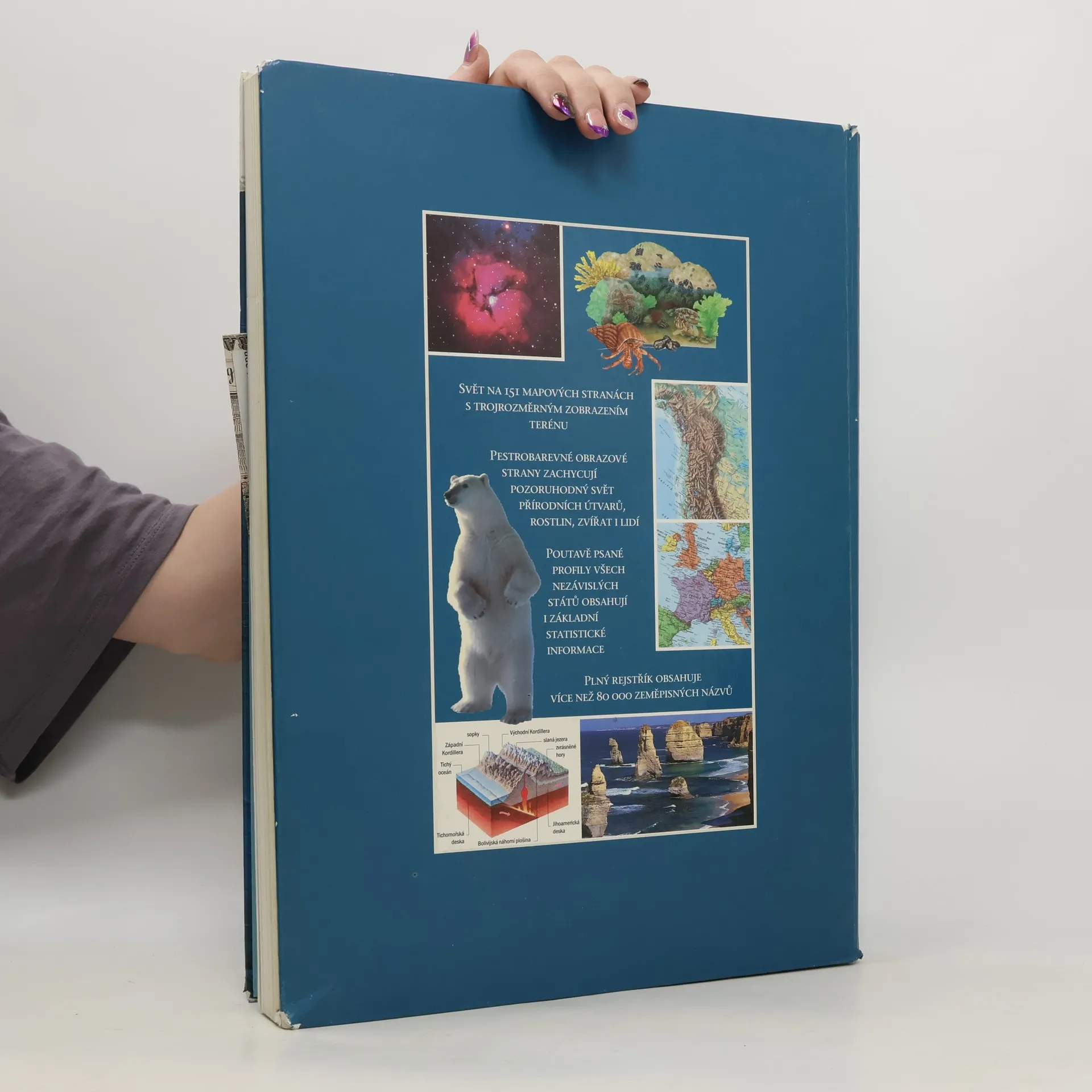 Svět na 151 mapových stranách s trojrozměrným zobrazením terénu. Pestrobarevné obrazové strany zachycují pozoruhodný svět přírodních útvarů, rostlin, zvířat i lidí. Poutavě psané profily všech nezávislých států obsahují i základní statistické informace. Plný rejstřík obsahuje více než 80 000 zeměpisných názvů. Obsah: 1. Příběh planety Země 2. Svět na mapách 3. Státy světa 4. Místopisný přehled