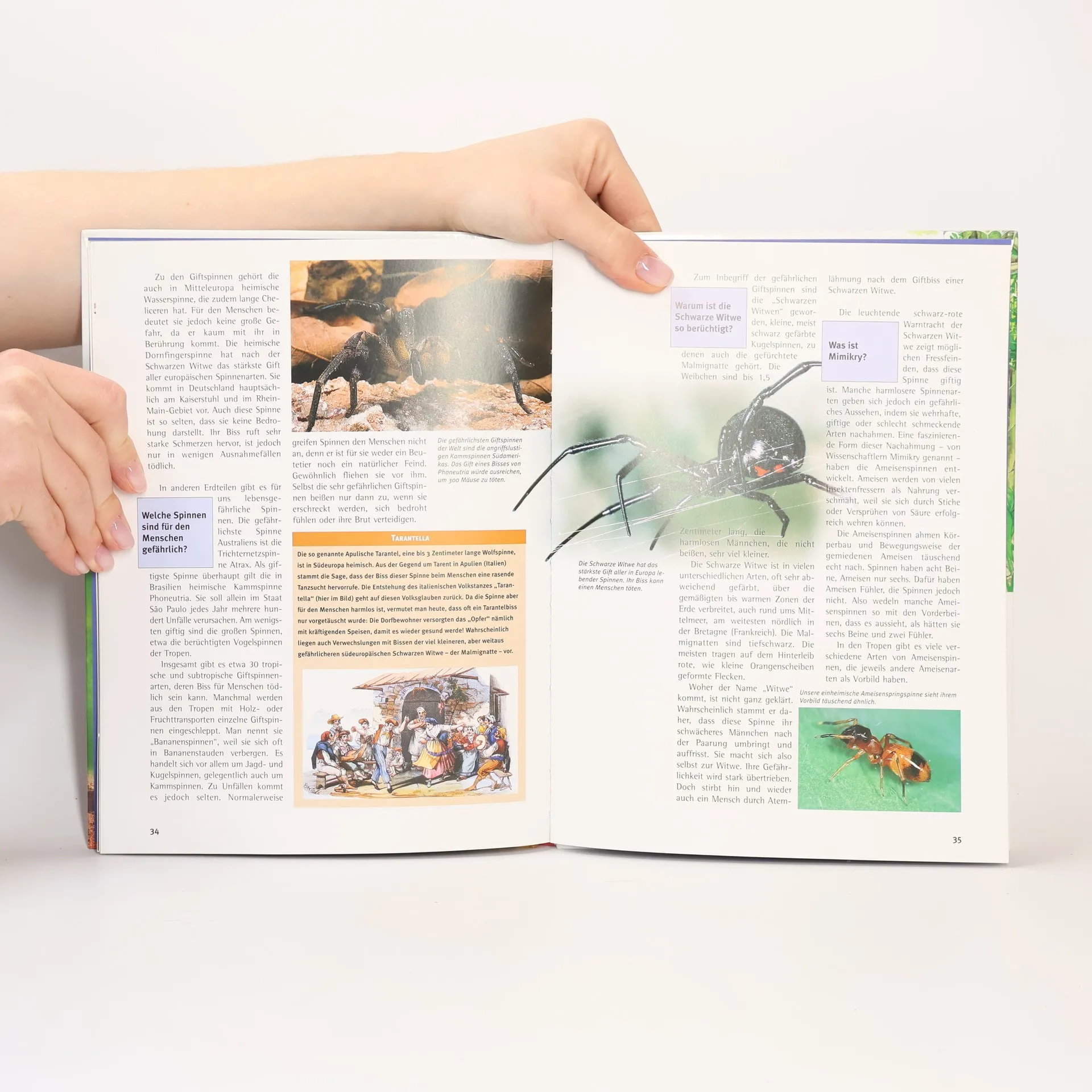Spinnen weben Netze oder gehen auf Jagd, können über Wasser laufen oder weit springen, sind unauffällig schwarz oder leuchtend gefärbt und leben überall auf der Welt. Welche Spinne jagt mit dem Lasso? Was sind Falltürspinnen? Warum ist die Schwarze Witwe so berüchtigt? Aus dem Vorwort von Heinz Sielmann: „Spinnenfurcht beruht hauptsächlich auf Unkenntnis. Dieses WAS IST WAS-Buch soll Tatsachen über Spinnen vermitteln. Ich will niemanden dazu überreden, sie für schön zu halten oder sie zu mögen. Aber wer erst einmal mit ihrem unglaublichen Leben etwas mehr vertraut ist, wird sie besser verstehen.“