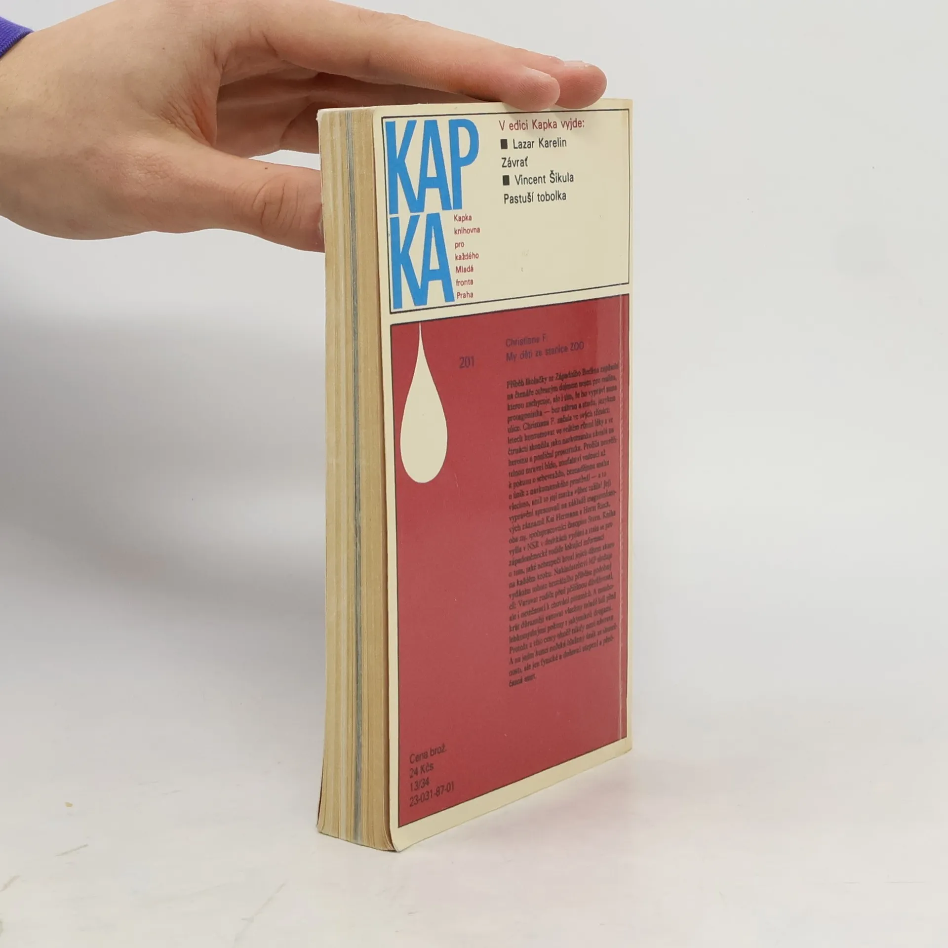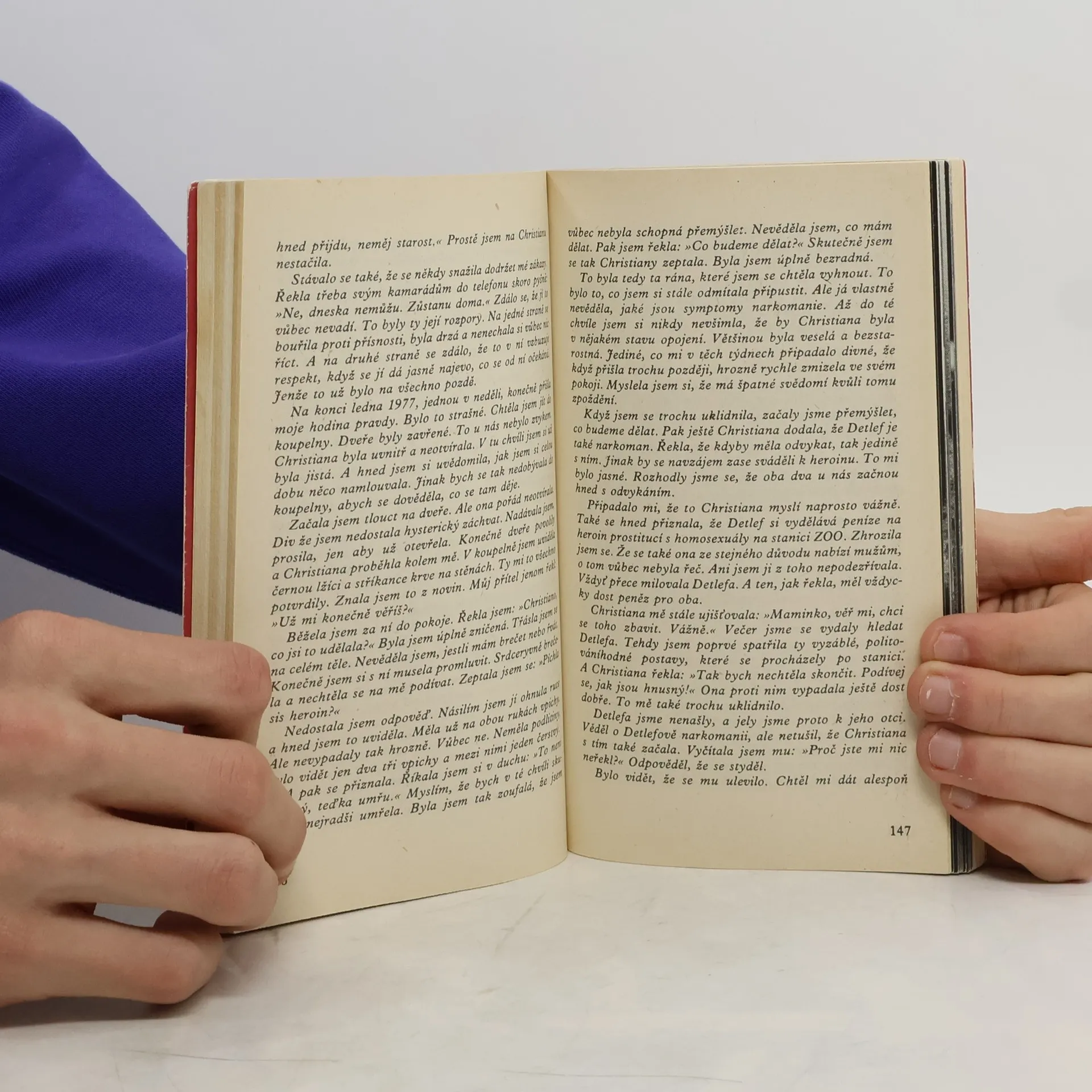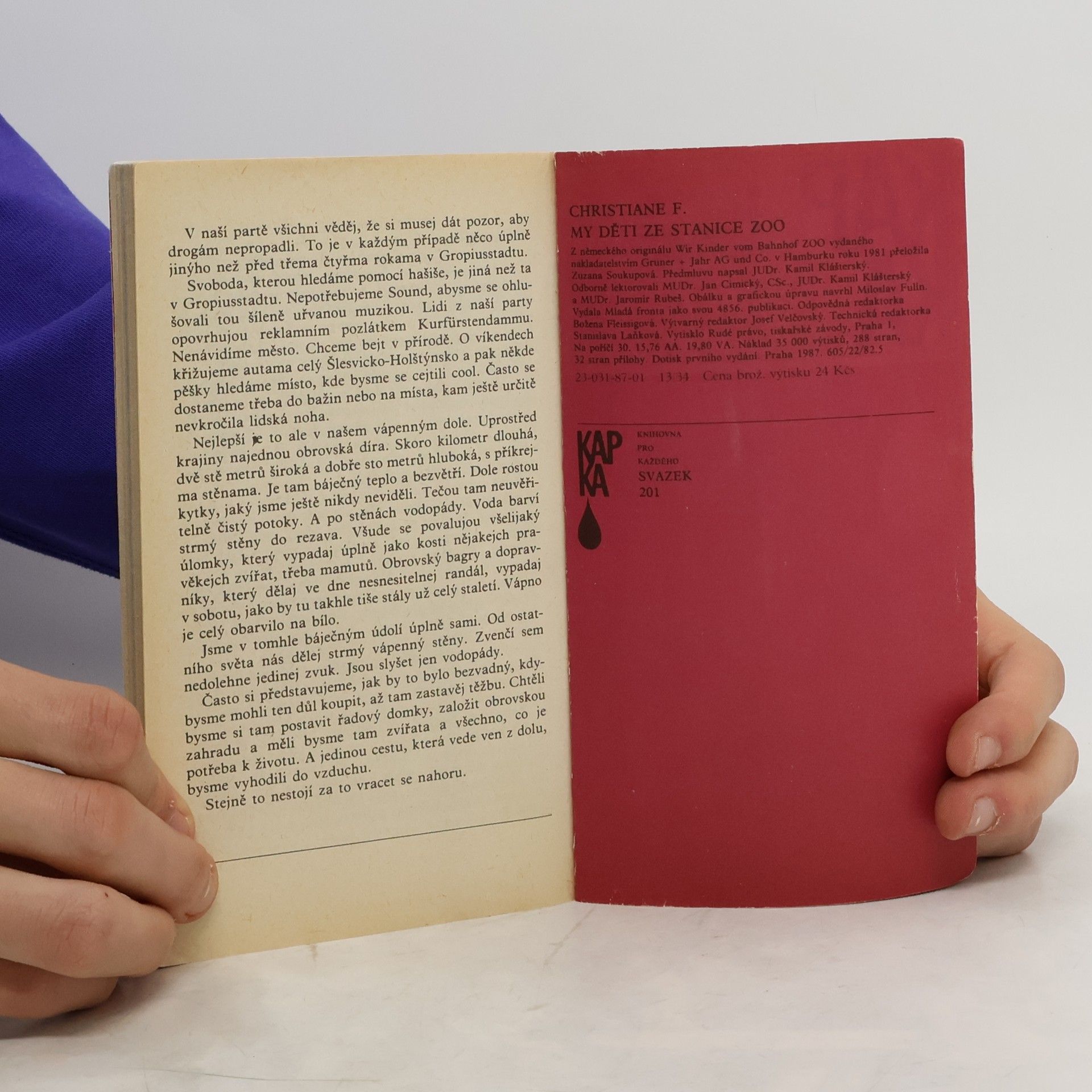 Mladistvá západoberlínská narkomanka ich-formou popisuje svůj příchod jako 6leté na berlínské sídliště Gropiusstadt s minimem možností zábavy pro děti. Neutěšené rodinné poměry vedoucí k rozvodu rodičů ji přivádí k hašišové partě v „Domě středu“. Následně postupně propadává světem drog až k těžké závislosti na heroinu a všemu, co s ní souvisí: těžké zhoršování zdravotního stavu, snaha opatřit si peníze na dávku (žebrání, krádeže, prostituce) a občasné zoufalé a neúspěšné pokusy zbavit se závislosti. Později se dívka závislosti na heroinu zbaví, ale pořád zůstává závislá na hašiši. Kniha obsahuje vlepenou 32 stránkovou fotografickou přílohu. Předmluvu napsal JUDr. Kamil Klášterský. Odborně lektorovali MUDr. Jan Cimický, CSc., JUDr. Kamil Klášterský a MUDr. Jaromír Rubeš. První vydání.