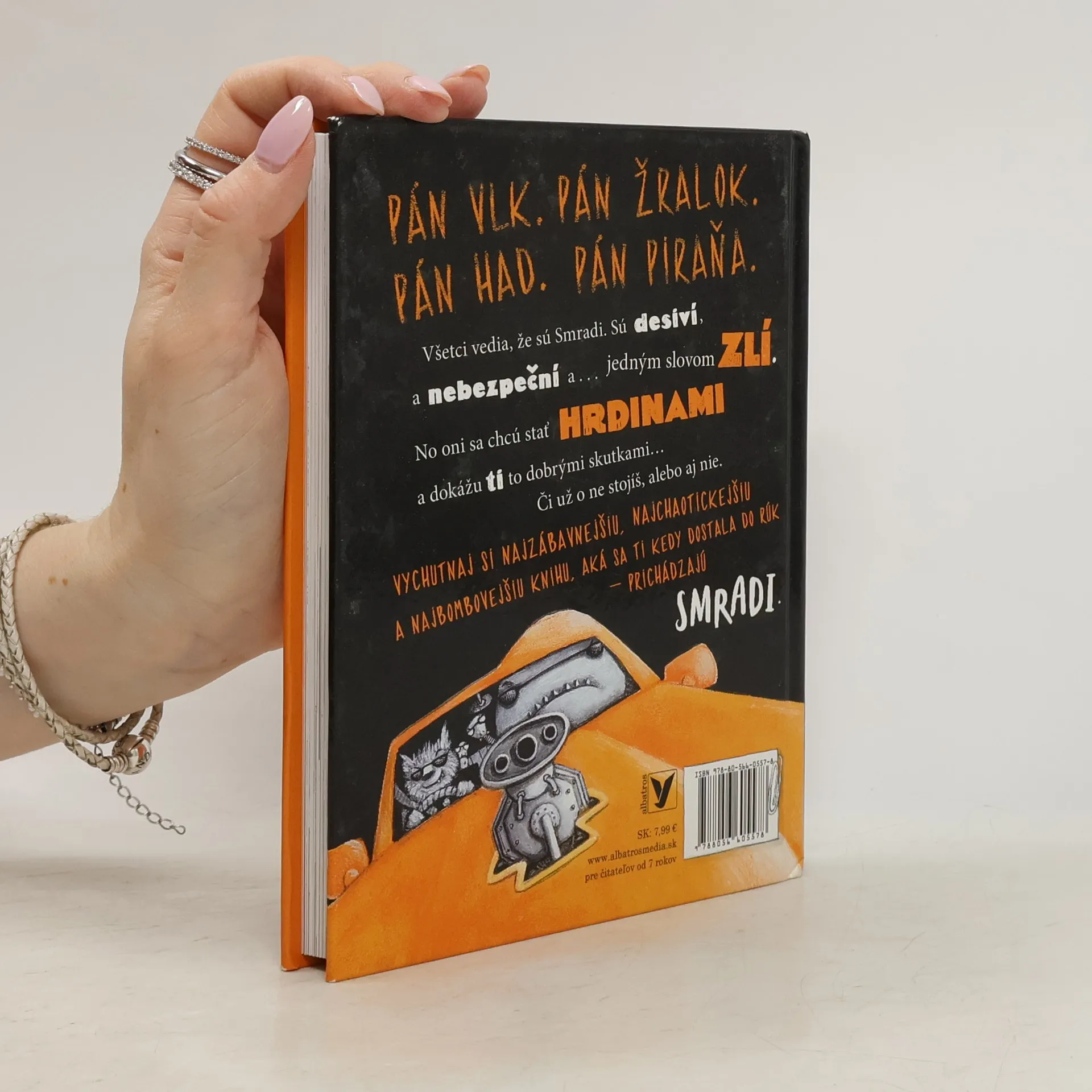 Pán Vlk. Pán Žralok. Pán Had. Pán Piraňa. Všetci vedia, že sú to Smradi. Sú desiví, nebezpeční a… jedným slovom zlí. No oni sa chcú stať hrdinami a dokážu ti to dobrými skutkami… či už o ne stojíš, alebo aj nie. Vychutnaj si najzábavnejšiu, najchaotickejšiu a najbombovejšiu knihu, aká sa ti kedy dostala do rúk – prichádzajú Smradi.