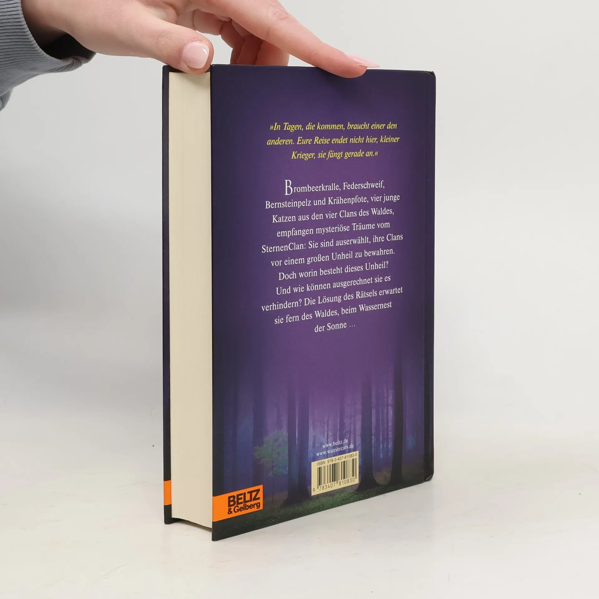 Die neue Prophezeiung: »Finsternis, Luft, Wasser und Himmel werden zusammentreffen... und den Wald bis in seine Wurzeln erschüttern.« »In Tagen, die kommen, braucht einer den anderen. Eure Reise endet nicht hier, kleiner Krieger, sie fängt gerade an.« Brombeerkralle, Federschweif, Bernsteinpelz und Krähenpfote, vier junge Katzen aus den vier Clans des Waldes empfangen mysteriöse Träume vom SternenClan: Sie sind auserwählt, ihre Clans vor einem großen Unheil zu bewahren. Doch worin besteht dieses Unheil? Und wie können ausgerechnet sie es verhindern? Die Lösung des Rätsels erwartet sie fern des Waldes, beim Wassernest der Sonne...
