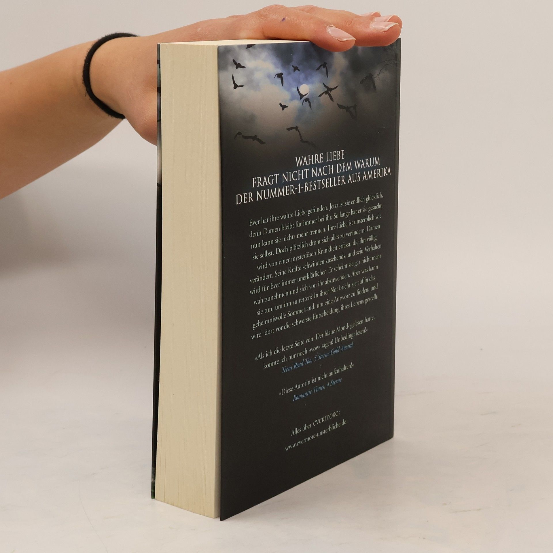 Die Evermore-Saga geht in die zweite Runde: Nachdem wir in Die Unsterblichen miterleben durften, wie die sechzehnjährige Ever nach dem Unfalltod ihrer Familie ihre paranormalen Fähigkeiten entdeckt und auf den unsterblichen Damen trifft, die Liebe ihres Lebens, sind wir nun in Der blaue Mond in der Normalität des Unsterblichendaseins angekommen: Ever, die die Gedanken von Menschen hören und ihre Auren als Farben sehen kann, ist nun auch unsterblich, und mit Damen genießt sie die ersten Tage ihrer gemeinsamen Liebe. Doch das Glück währt – natürlich – nicht lange. Denn an Evers Schule taucht ein neuer Junge auf, Roman, um dessen Gunst sich alle reißen, nur Ever fühlt sich in seiner Gegenwart auf diffuse Weise unwohl. Außerdem scheinen ihre Kräfte bei Roman nicht zu wirken, und auch Damen verändert sich, seit Roman da ist: Seine übernatürlichen Fähigkeiten werden immer schwächer, er wird regelrecht krank und verhält sich ihr gegenüber zunehmend merkwürdig, ja sogar abweisend. Ever wird klar, dass das Leben ihres Seelenpartners in Gefahr ist, und sie weiß, dass sie sich auf die gefährliche Reise ins Sommerland begeben muss, um ihn zu retten...