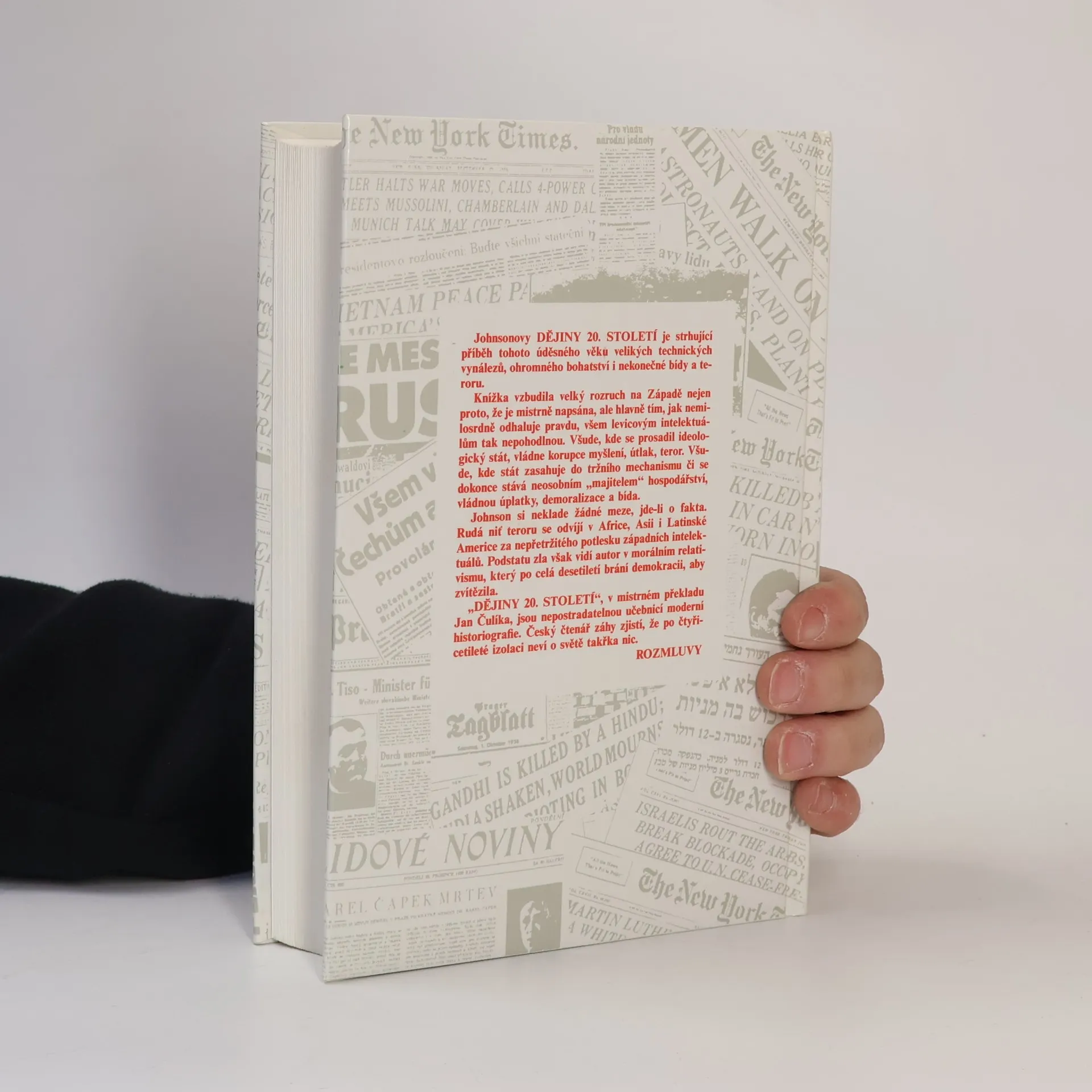 Johnsonovo dílo Dějiny 20. století je strhující příběh tohoto úděsného věku velkých technických vynálezů, ohromného bohatství i nekonečné bídy a teroru. Knížka vzbudila velky rozruch na Západě nejen proto, že je mistrně napsána, ale hlavně tím, jak nemilosrdně odhaluje pravdu, všem levicovym intelektuálům tak nepohodlnou. Všude, kde se prosadil ideologický stát, vládne korupce myšlení, útlak, teror. Všude, kde stát zasahuje do tržního mechanismu či se dokonce stává neosobním „majitelem" hospodářství, vládnou úplatky, demoralizace a bída. Johnson si neklade žádné meze, jde-li o fakta. Rudá nit teroru se odvíjí v Africe, Asii i Latinské Americe za nepřetržitého potlesku západních intelektuálů. Podstatu zla však vidí autor v morálním relativismu, který po celá desetiletí brání demokracii, aby zvítězila. „DĚJINY 20. STOLETÍ" v mistrném překladu Jana Čulíka jsou nepostradatelnou učebnicí moderní historiografie. Čtenář záhy zjistí, že po čtyřicetileté izolaci neví o novodobých dějinách světa takřka nic.