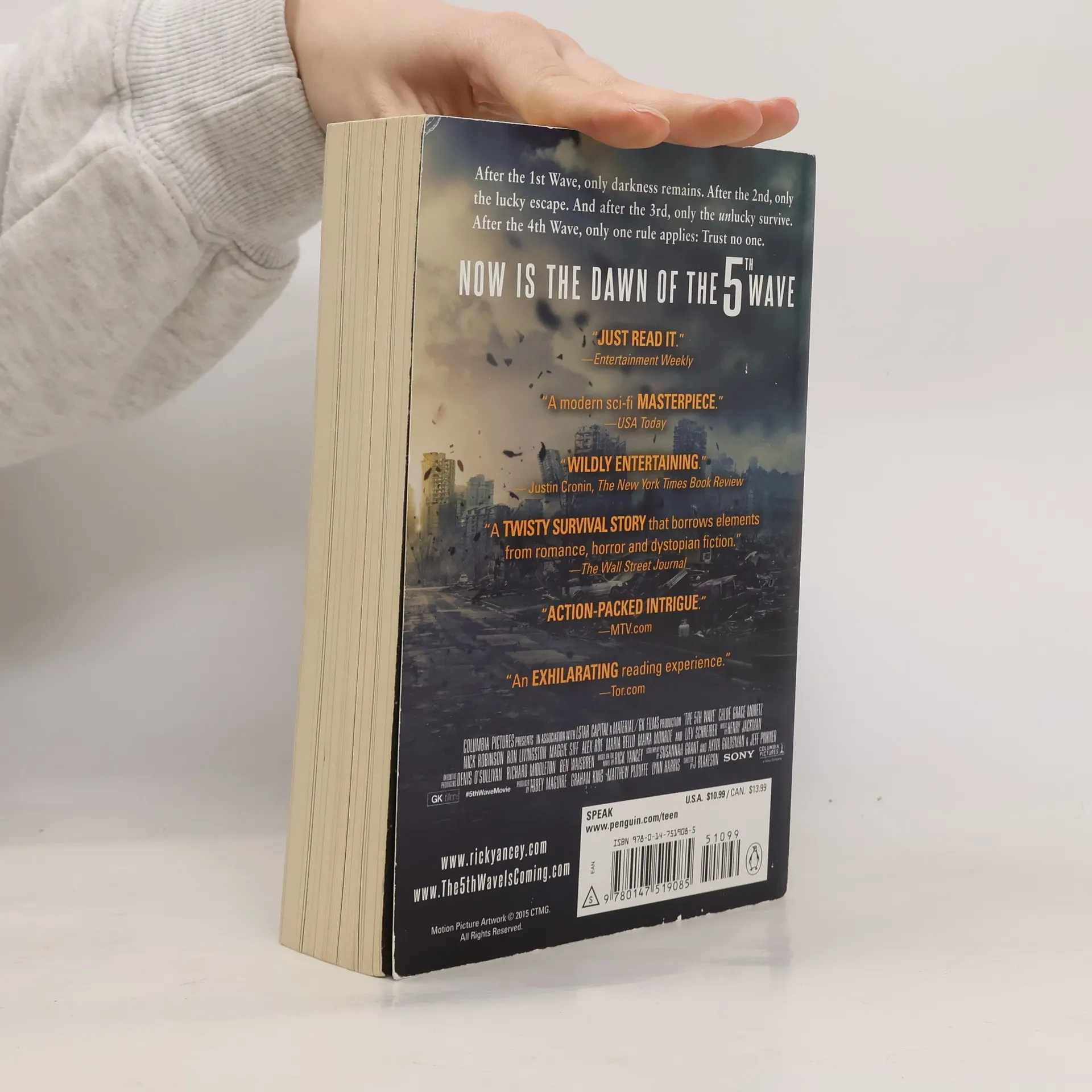 The New York Times bestseller comes to the big screen! A USA Today bestseller Winner of the 2014 Red House Children's Book Award 2014 Children's Choice Book Awards Finalist for Teen Book of the Year A YALSA 2014 Best Fiction for Young Adults A YALSA 2014 Quick Picks for Reluctant Young Readers A Booklist 2014 Best Fiction for Young Adults A VOYA 2013 Perfect Ten An Amazon Best Book of the Year "Remarkable, not-to-be-missed-under-any-circumstances."--Entertainment Weekly The Passage meets Ender's Game in an epic New York Times bestselling series debut from award-winning author Rick Yancey. After the 1st wave, only darkness remains. After the 2nd, only the lucky escape. And after the 3rd, only the unlucky survive. After the 4th wave, only one rule applies: trust no one. Now, it's the dawn of the 5th wave, and on a lonely stretch of highway, Cassie runs from Them. The beings who only look human, who roam the countryside killing anyone they see. Who have scattered Earth's last survivors. To stay alone is to stay alive, Cassie believes, until she meets Evan Walker. Beguiling and mysterious, Evan Walker may be Cassie's only hope for rescuing her brother--or even saving herself. But Cassie must choose: between trust and despair, between defiance and surrender, between life and death. To give up or to get up. "Wildly entertaining . . . I couldn't turn the pages fast enough."--Justin Cronin, The New York Times Book Review "A modern sci-fi masterpiece . . . should do for aliens what Twilight did for vampires."--USAToday.com Books in the series: The 5th Wave (The First Book of The 5th Wave) The Infinite Sea (The Second Book of The 5th Wave) The Last Star (The Third Book of the The 5th Wave)