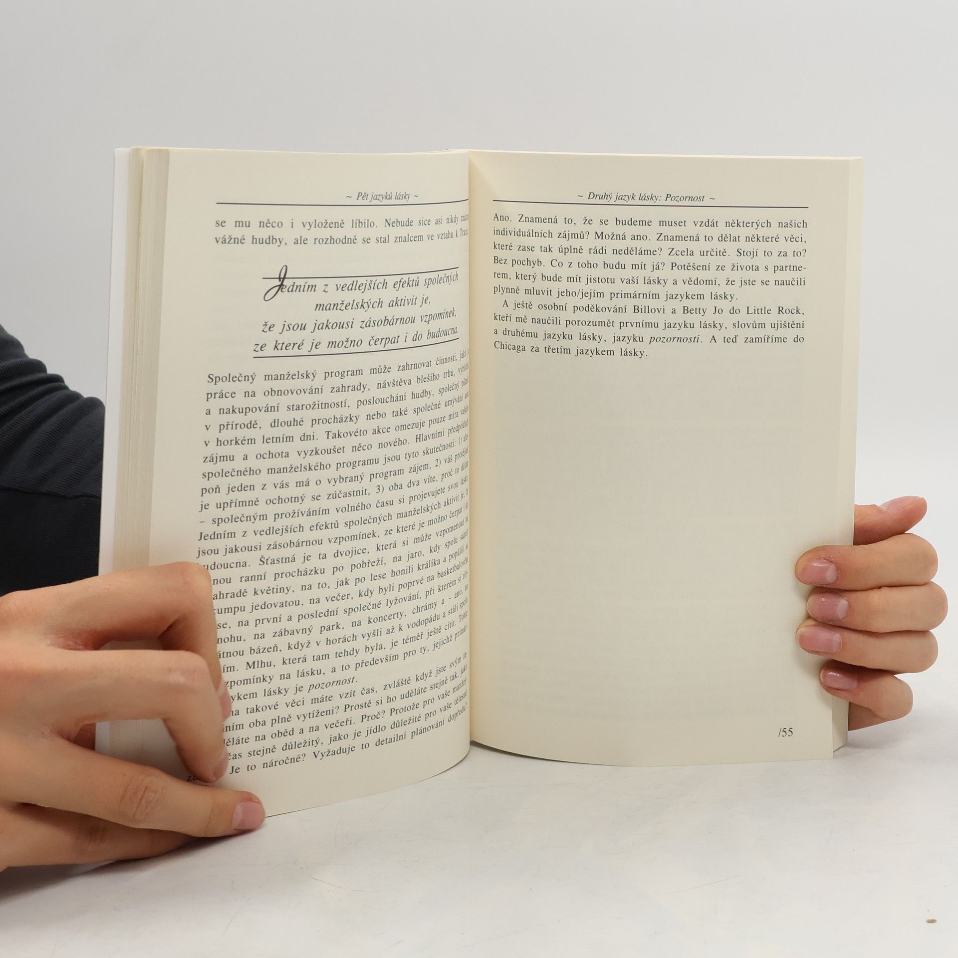 Naučte se hovořit jazykem lásky toho druhého / Manželský poradce přináší zcela nový pohled na manželské soužití: chcete-li prožít harmonický vztah, pak se potřebujete naučit hovořit jazykem lásky svého partnera. Práce přibližuje a na konkrétních manželských párech a jejich problémech ilustruje následující základní jazyky lásky: slova ujištění, pozornost, přijímání daru, skutky služby a fyzický kontakt. Kniha je ideálním dárkem pro všechny snoubence a manžele. Dotisk v roce 2009.