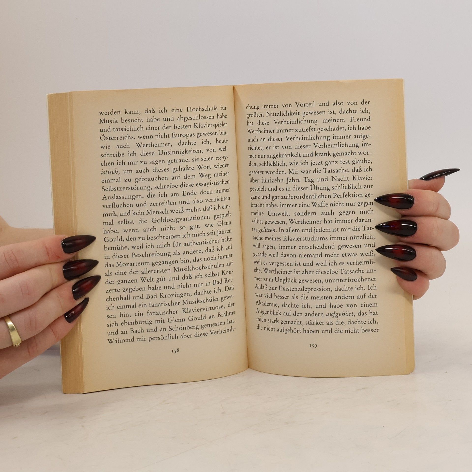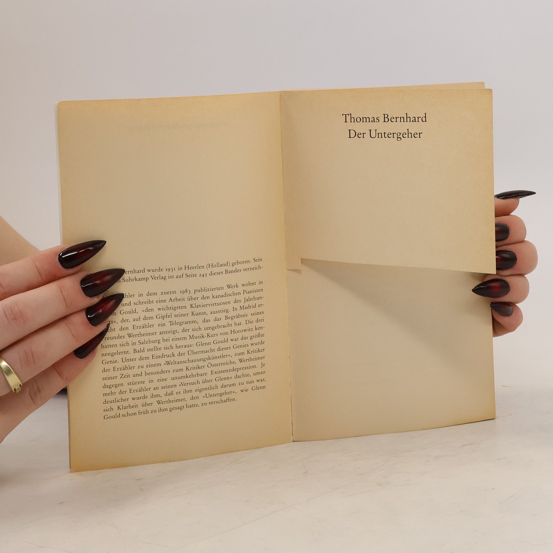 Der Erzähler in dem zuerst 1983 publizierten Werk wohnt in Madrid und schreibt eine Arbeit über den kanadischen Pianisten Glenn Gould, »den wichtigsten Klaviervirtuosen des Jahrhunderts«, der, auf dem Gipfel seiner Kunst, aufhörte zu spielen. In Madrid erreicht den Erzähler ein Telegramm, das das Begräbnis seines Freundes Wertheimer anzeigt, der sich umgebracht hat. Die drei hatten sich in Salzburg bei einem Musikkurs von Horowitz kennengelernt. Bald stellte sich heraus: Glenn Gould war das größte Genie. Unter dem Eindruck der Übermacht dieses Genies wurde der Erzähler zu einem »Weltanschauungskünstler«, zum Kritiker seiner Zeit und besonders zum Kritiker Österreichs, Wertheimer dagegen stürzte in eine unumkehrbare Existenzdepression. Je mehr der Erzähler an seinen »Versuch über Glenn« dachte, um so deutlicher wurde ihm, daß es ihm eigentlich darum zu tun war, sich Klarheit über Wertheimer, den »Untergeher«, wie Glenn Gould schon früh zu ihm gesagt hatte, zu verschaffen.