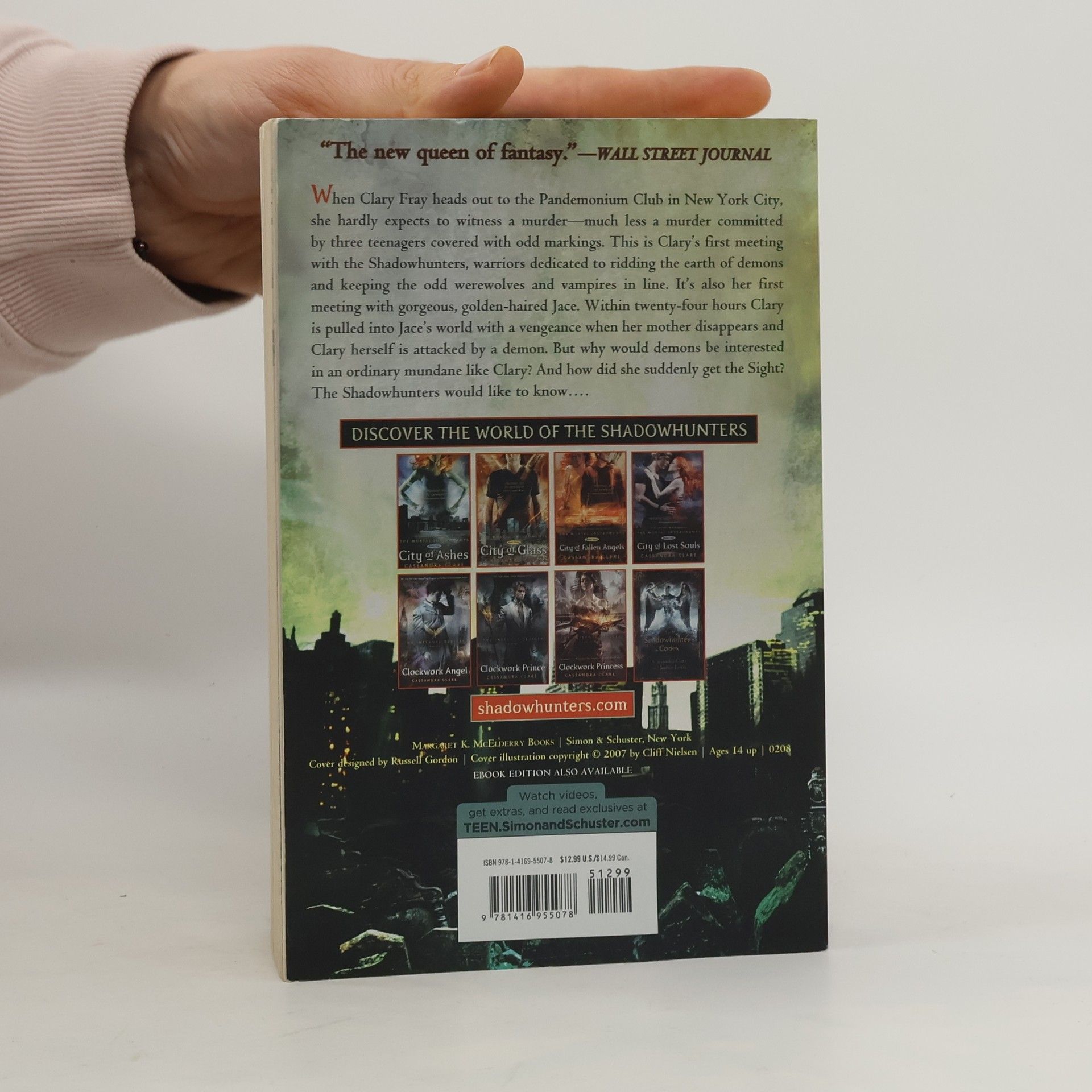 When Clary Fray heads out to the Pandemonium Club in New York City, she hardly expects to witness a murder. Much less a murder commited by three teenagers covered with odd markings. This is Clary's first meeting with the Shadowhunters, warriors dedicated to ridding the earth of demons--and keeping the odd werewolves and vampires in line. It's also her first meeting with gorgeous, golden-haired Jace. Within twenty-four hours Clary is pulled into Jace's world with a vengeance, when her mother disappears and Clary herself is attacked by a demon. But why would demons be interested in an ordinary mundane like Clary? And how did she suddenly get the Sight? The Shadowhunters would like to know.... Librarian's note: See alternate cover editions with this ISBN here and here.