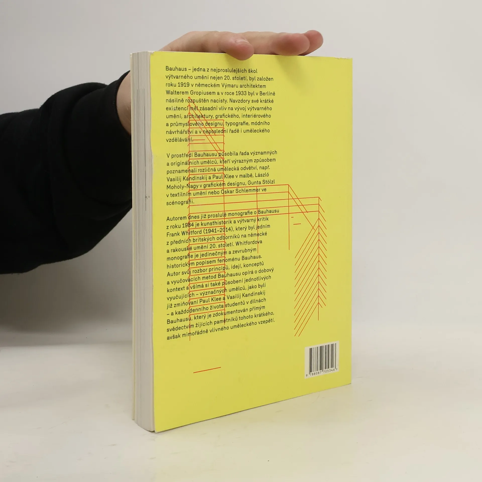 Bauhaus – jedna z nejproslulejších škol výtvarného umění nejen 20. století, byl založen roku 1919 v německém Výmaru architektem Walterem Gropiusem a v roce 1933 byl v Berlíně násilně rozpuštěn nacisty. Navzdory své krátké existenci měl zásadní vliv na vývoj výtvarného umění, architektury, grafického, interiérového a průmyslového designu, typografie, módního návrhářství a v neposlední řadě i uměleckého vzdělávání. V prostředí Bauhausu působila řada významných a originálních umělců, kteří výrazným způsobem poznamenali rozličná umělecká odvětví, např. Vasilij Kandinskij, Paul Klee a László Moholy-Nagy v malbě, Gunta Stölzl v textilním umění nebo Oskar Schlemmer ve scénografii. Autorem dnes již proslulé monografie o Bauhausu z roku 1984 je kunsthistorik a výtvarný kritik Frank Whitford (1941–2014), který byl jedním z předních britských odborníků na německé a rakouské umění 20. století. Whitfordova monografie je jedinečným a zevrubným historickým popisem fenoménu Bauhaus. Autor svůj rozbor principů, idejí, konceptů a vyučovacích metod Bauhausu opírá o dobový kontext a všímá si také působení jednotlivých vyučujících – význačných umělců, jako byli již zmiňovaní Paul Klee a Vasilij Kandinskij – a každodenního života studentů v dílnách Bauhausu, který je zdokumentován přímým svědectvím žijících pamětníků tohoto krátkého, avšak mimořádně vlivného uměleckého vzepětí.
