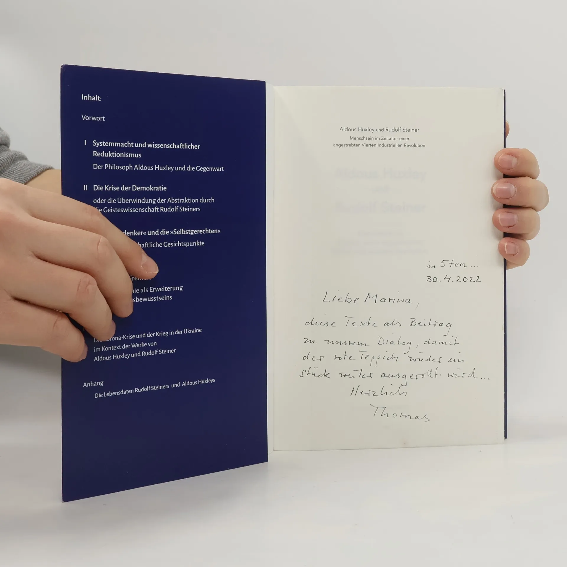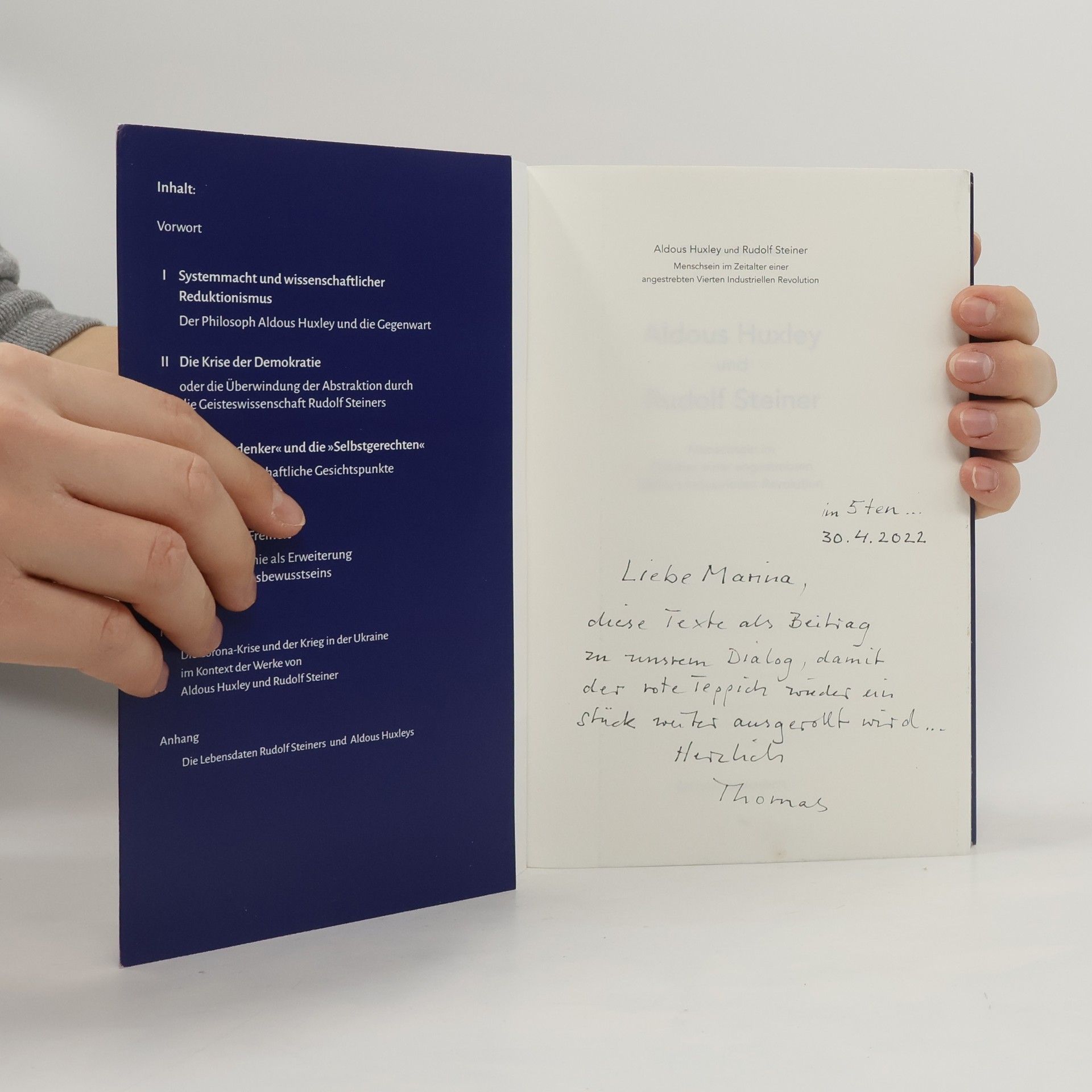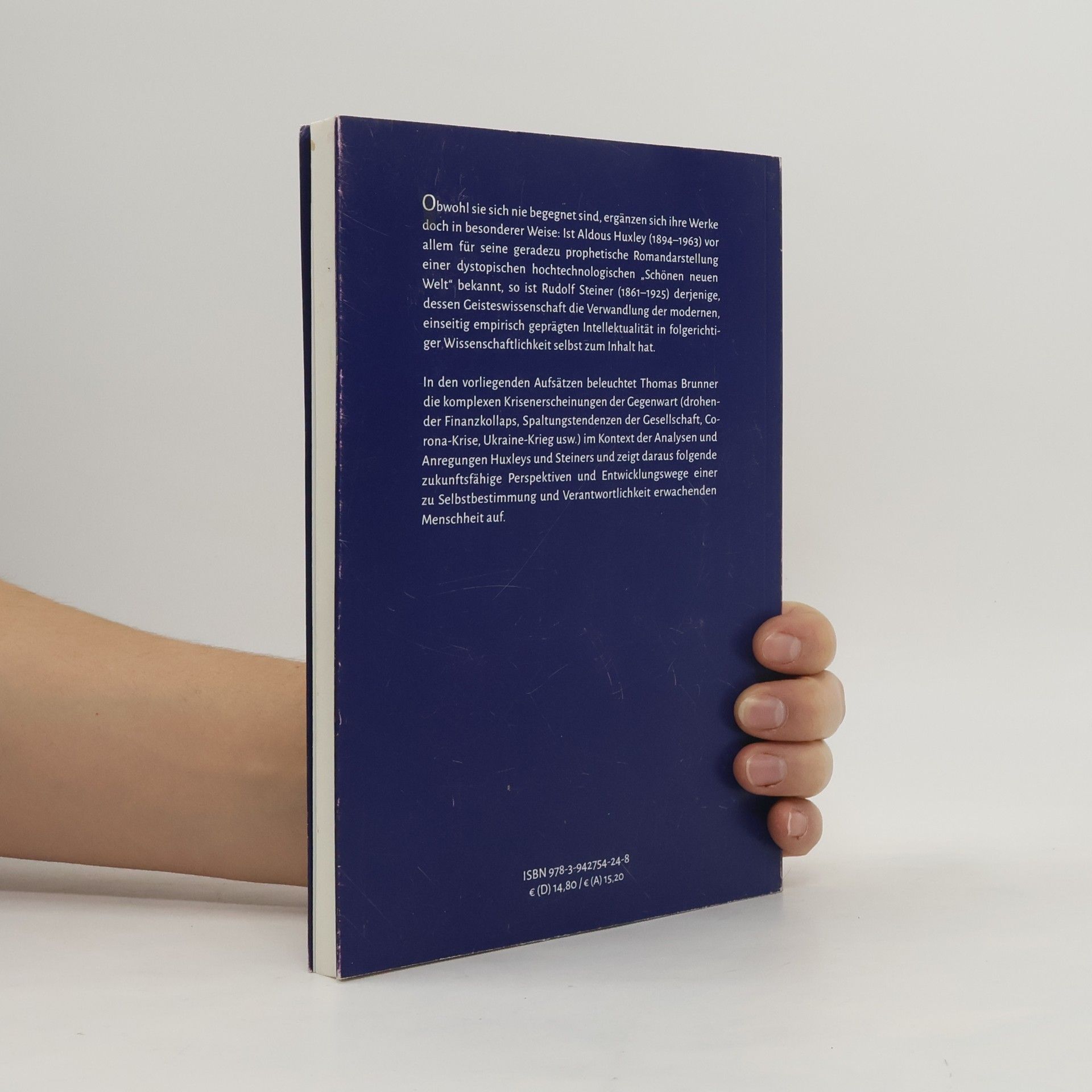 "Obwohl sie sich nie begegnet sind, ergänzen sich ihre Werke doch in besonderer Weise: Ist Aldous Huxley (1894–1963) vor allem für seine geradezu prophetische Romandarstellung einer dystopischen hochtechnologischen „Schönen neuen Welt“ bekannt, so ist Rudolf Steiner (1861–1925) derjenige, dessen Geisteswissenschaft die Verwandlung der modernen, einseitig empirisch geprägten Intellektualität in folgerichtiger Wissenschaftlichkeit selbst zum Inhalt hat. In den vorliegenden Aufsätzen beleuchtet Thomas Brunner die komplexen Krisenerscheinungen der Gegenwart (drohender Finanzkollaps, Spaltungstendenzen der Gesellschaft, Corona-Krise, Ukraine-Krieg usw.) im Kontext der Analysen und Anregungen Huxleys und Steiners und zeigt daraus folgende zukunftsfähige Perspektiven und Entwicklungswege einer zu Selbstbestimmung und Verantwortlichkeit erwachenden Menschheit auf." -- Page 4 of cover