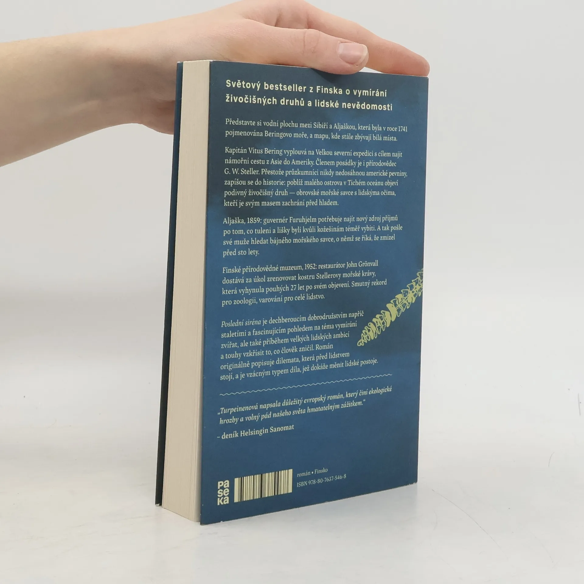 Přírodovědec a teolog Georg Wilhelm Steller se v roce 1741 připojuje k Velké severní expedici, při níž kapitán Vitus Bering a jeho posádka hledají námořní cestu z Asie do Ameriky. Přestože nikdy nedosáhnou americké pevniny, zapíšou se do historie: Objeví sirénu, nazývanou též ochechule nebo mořská kráva. Zhruba o sto let později vyšle Hampus Furuhjelm, finský guvernér ruského území Aljašky, své muže hledat kostru tohoto mohutného mořského savce, o němž se říká, že zmizel před sto lety. V roce 1952 dostává John Grönvall, restaurátor v dnešním Finském přírodovědném muzeu, za úkol zrenovovat kostru Stellerovy mořské krávy, která je v té době již vyhubená. Poslední siréna je dechberoucím dobrodružstvím napříč staletími a fascinujícím pohledem na téma vymírání živočišných druhů, ale také příběhem velkých lidských ambicí a touhy vzkřísit to, co člověk ve své nevědomosti zničil. Román originálně popisuje dilemata, která před lidstvem stojí, a je vzácným typem díla, jež dokáže měnit lidské postoje.
