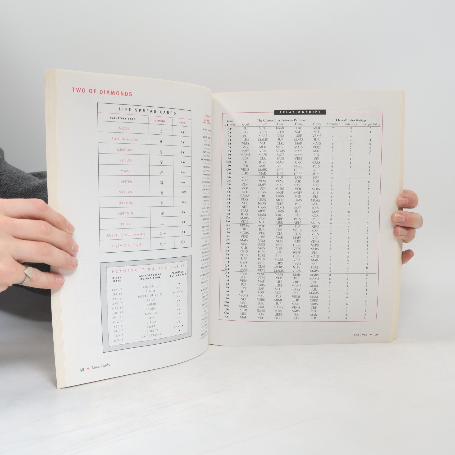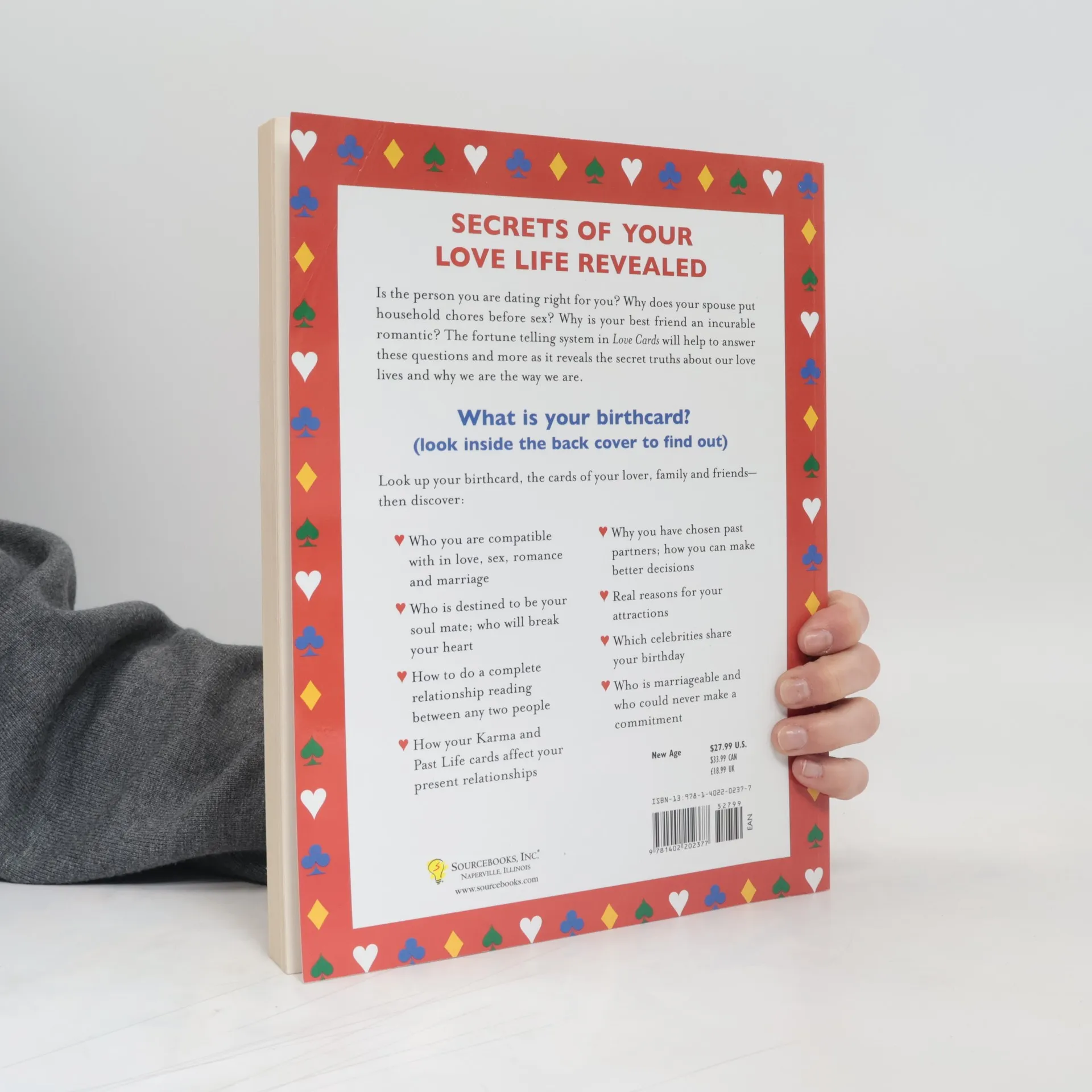 Your birthdate reveals more about you than you might imagine.Did you ever wonder why some people are afraid of commitment and others always put work before love? Is the woman you met last night right for you? Why does your spouse put household chores before sex? Why is your best friend an incurable romantic?The newly discovered fortune telling system in Love Cards offers explanations for why we are the way we are and reveals the secret truths about our love life.First, use your birthdate to find your birth card. Discover everything from karma you might be carrying from a past life to which celebrities share your card. Then check out your lovers', family's and friends' cards. Your compatibility chart will tell you who is destined to be your soulmate and who will break your heart.--Find out exactly who you are compatible with in love, sex, romance & marriage.--Learn quickly how to do a complete relationship reading between any two people.--Find out how your Karma and Past Life cards affect your present relationships.--Discover why you have chosen past partners and learn to make better decisions.--Explore the real reasons for your attractions--it's really card chemistry!