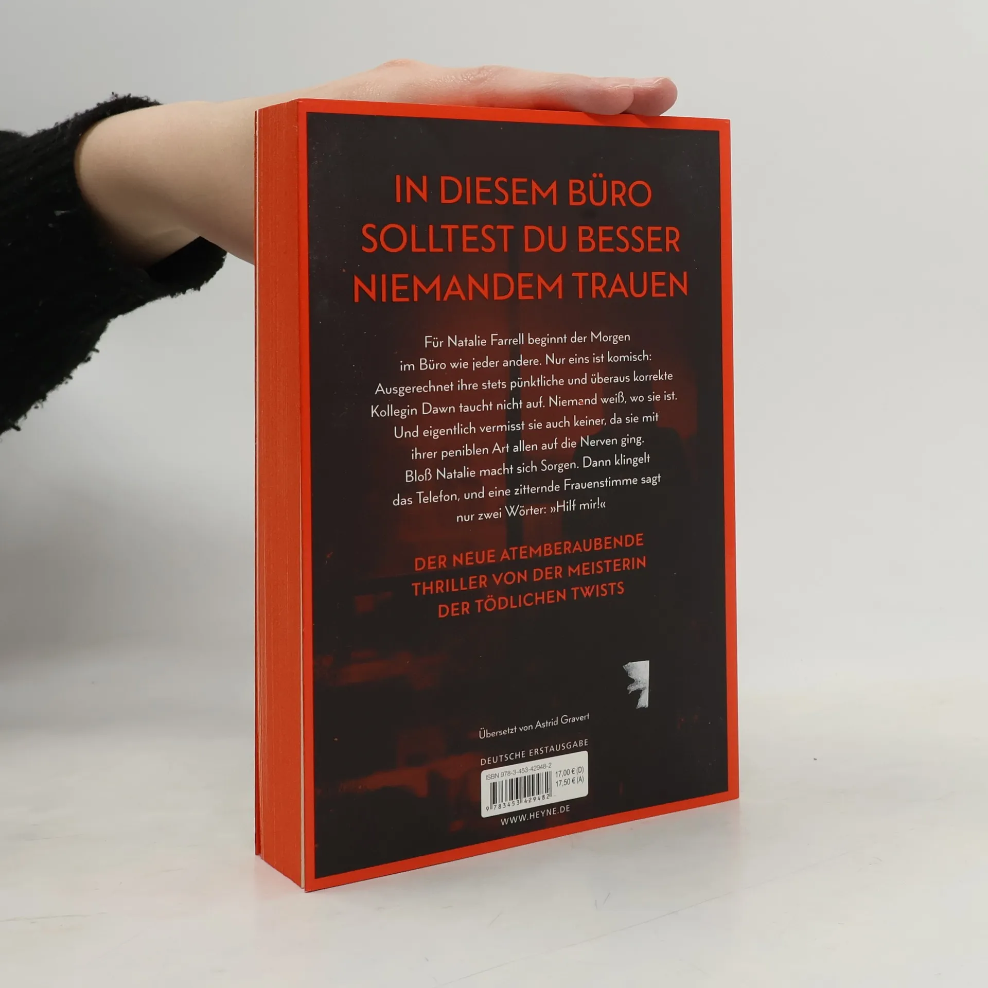 Zwei Frauen. Ein Büro. Ein schreckliches Verbrechen. Mit farbig gestaltetem Buchschnitt in limitierter Erstauflage Dawn Schiff ist seltsam. Darin sind sich ihre Kollegen einig. Sie sagt nie das Richtige. Sie hat keine Freunde. Aber sie ist jeden Morgen um Punkt 8:45 Uhr an ihrem Platz in der Firma, in der sie als Buchhalterin arbeitet. Bis sie eines Morgens nicht auftaucht. Dawns Kollegin Natalie Farrell wundert sich. Dann erhält sie einen anonymen Anruf und fährt zu Dawns Wohnung. Keine Spur von ihrer Kollegin. Doch Natalie bietet sich ein Bild des Grauens. Eins scheint bald klar: Jemand muss Dawn so sehr gehasst haben, dass er sie getötet hat. War es jemand aus ihrem Büro? Je mehr Natalie herausfindet, desto tiefer verstrickt sie sich selbst in ein Netz aus Lügen und Gewalt, aus dem es kein Entkommen gibt. Mit farbig gestaltetem Buchschnitt