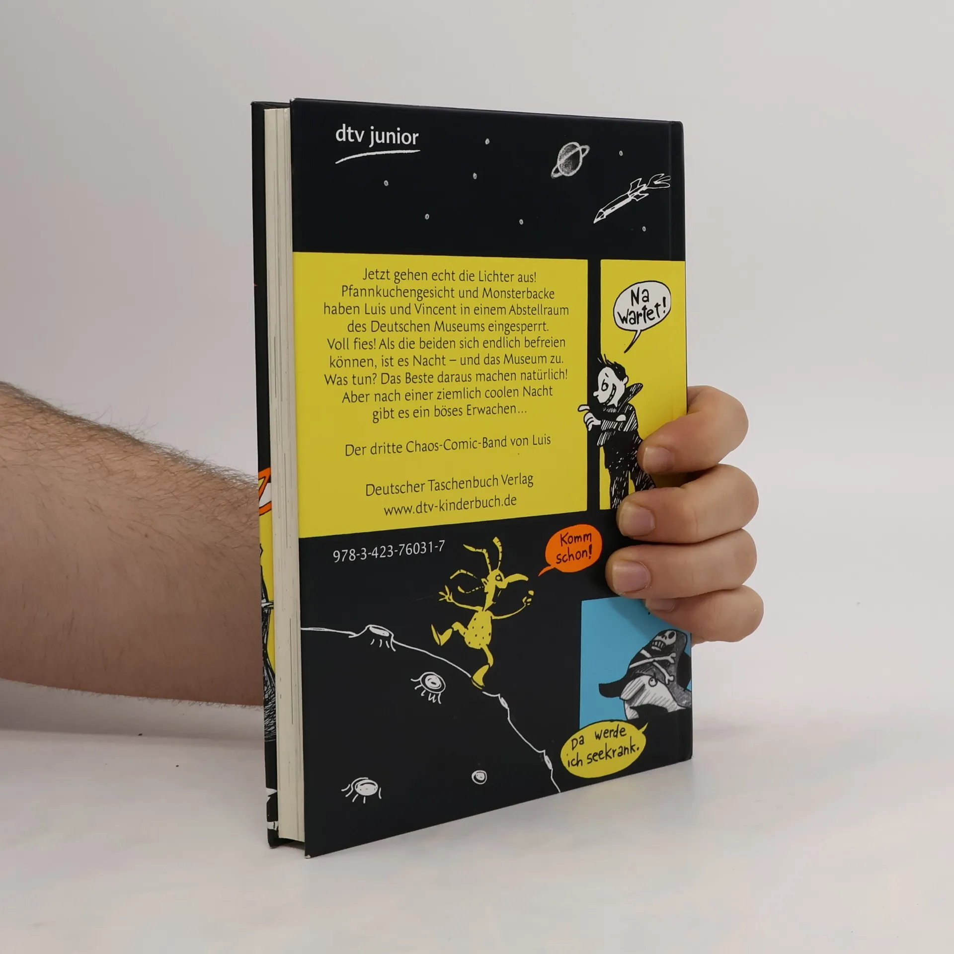 -Comicroman”Luis Chaos Comics von Dagmar Geisler sind eine gelungene Mischung aus Texten und Comicbildern, die Lust auf mehr machen.“Oldenburgische Volkszeitung 02.07.2011 Kurzbeschreibung Jetzt gehen echt die Lichter aus!”Pfannkuchengesicht“und”Monsterbacke“haben sich etwas besonders Fieses überlegt und Luis und Vincent im Deutschen Museum im Bauch eines alten Schiffes eingesperrt. Als Luis und Vincent sich endlich befreien können, ist es Nacht und das Museum zu. Was tun? Das Beste daraus machen natürlich. Aber nach einer ziemlich coolen Nacht gibt es für die zwei ein böses Erwachen ...