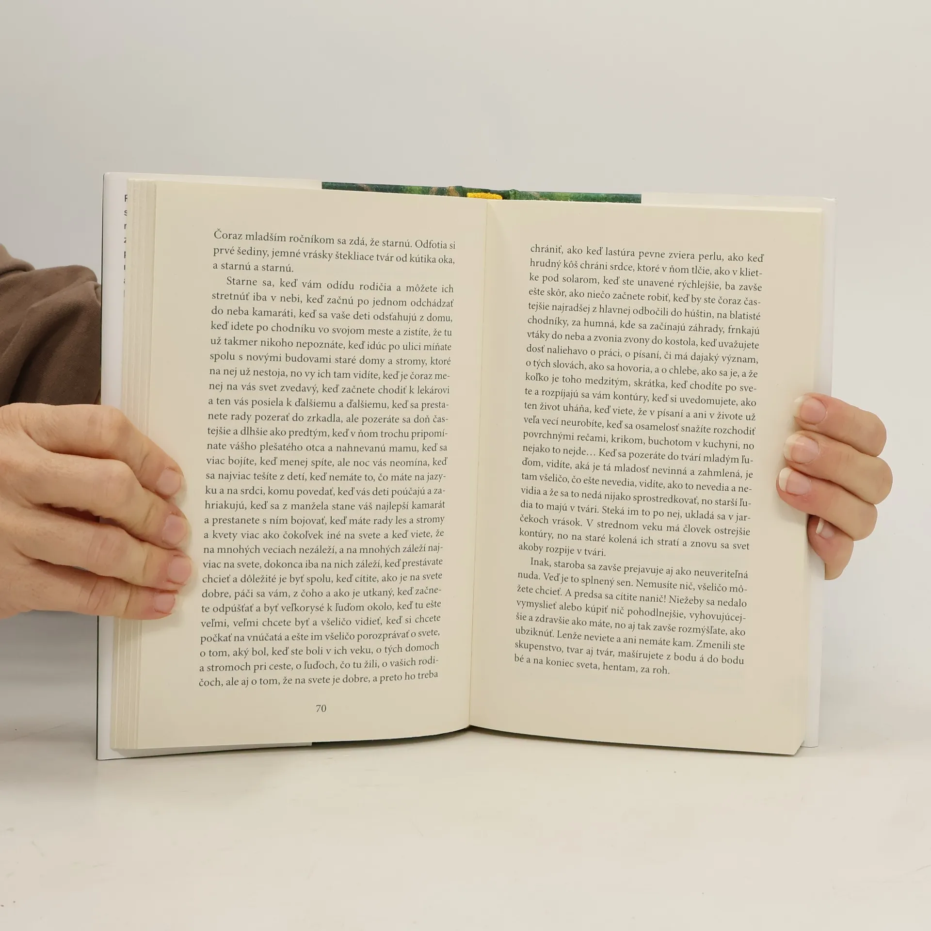 Román o manželstve odohrávajúci sa sčasti vo Francúzsku a sčasti na Slovensku je inventúrou udalostí, zážitkov, rozprávaním o vzťahu jeho protagonistov od prvého vzájomného očarenia cez sériu odlúčení a opätovných stretnutí až po čas, keď obaja v pokročilom veku rekapitulujú vlastnýživot a puto medzi nimi. Próza sa odohráva na rozhraní 20. a 21. storočia v geograficky aj historicky inom svete, ako je dnes, mohla by byť aj parodickým i rozprávkovým príbehom lásky alebo zamyslením nad povahou času. Román o malých starostiach a strachoch, veľkých radostiach a malých šťastiach.