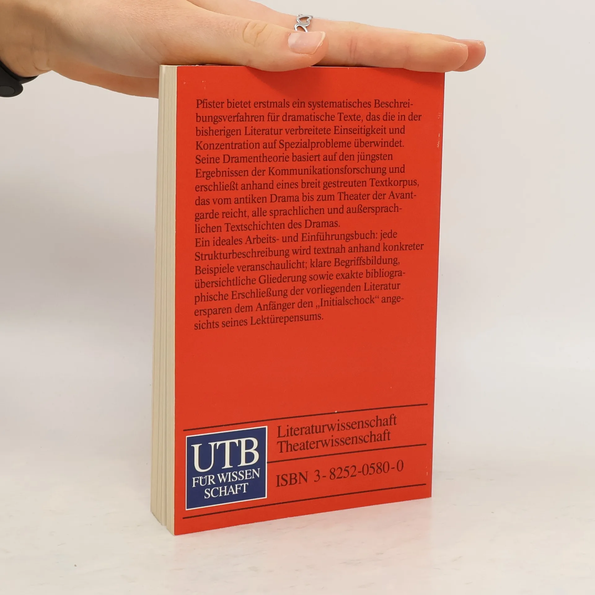 Pfister bietet erstmals ein systematisches Beschreibungsverfahren für dramatische Texte, das die in der bisherigen Literatur verbreitete Einseitigkeit und Konzentration auf Spezialprobleme überwindet. Seine Dramentheorie basiert auf den jüngsten Ergebnissen der Kommunikationsforschung und erschließt anhand eines breit gestreuten Textkorpus, das vom antiken Drama bis zum Theater der Avantgarde reicht, alle sprachlichen und außersprachlichen Textschichten des Dramas. Ein ideales Arbeits- und Einführungsbuch: jede Strukturbeschreibung wird textnah anhand konkreter Beispiele veranschaulicht; klare Begriffsbildung, übersichtliche Gliederung sowie exakte bibliographische Erschließung der vorliegenden Literatur ersparen dem Anfänger den „Initialschock“ angesichts seines Lektürepensums.