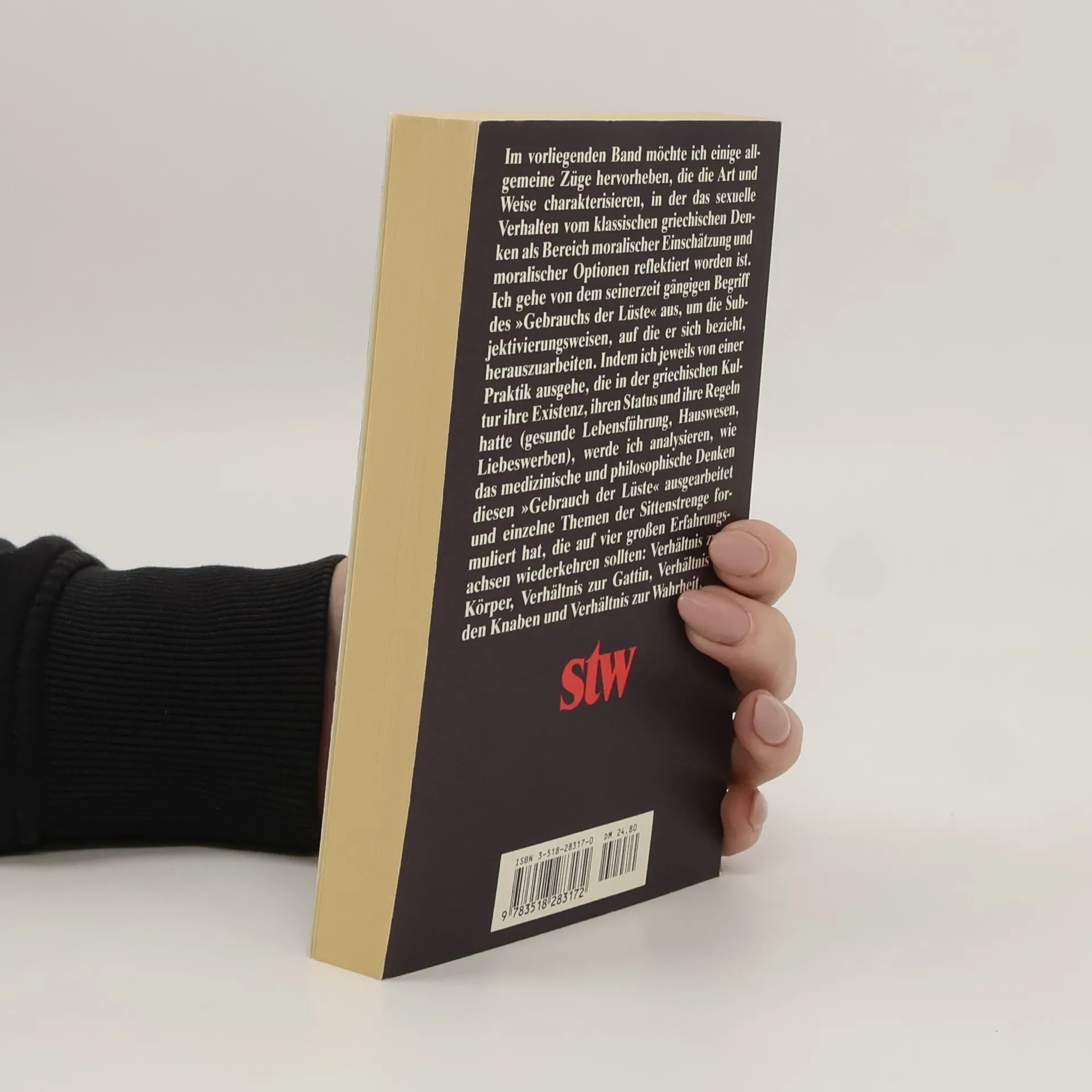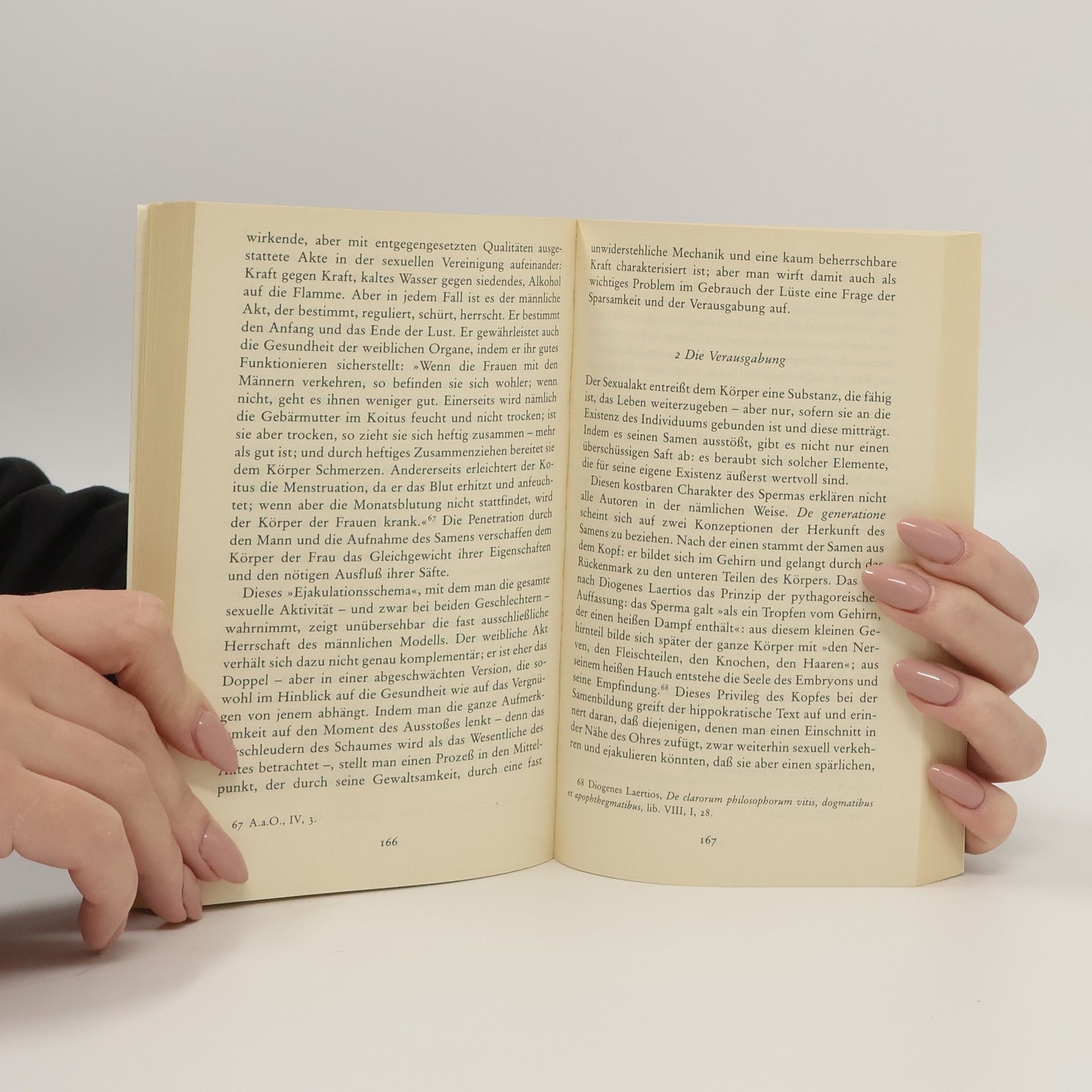 »Im vorliegenden Band möchte ich einige allgemeine Züge hervorheben, die die Art und Weise charakterisieren, in der das sexuelle Verhalten vom klassischen griechischen Denken als Bereich moralischer Einschätzung und moralischer Optionen reflektiert worden ist. Ich gehe von dem seinerzeit gängigen Begriff des ›Gebrauchs der Lüste‹ aus, um die Subjektivierungsweisen, auf die er sich bezieht, herauszuarbeiten. Indem ich jeweils von einer Praktik ausgehe, die in der griechischen Kultur ihre Existenz, ihren Status und ihre Regeln hatte (gesunde Lebensführung, Hauswesen, Liebeswerben), werde ich analysieren, wie das medizinische und philosophische Denken diesen ›Gebrauch der Lüste‹ ausgearbeitet und einzelne Themen des Sittenstrenge formuliert hat, die auf vier großen Erfahrungsachsen wiederkehren sollten: Verhältnis zum Körper, Verhältnis zur Gattin, Verhältnis zu den Knaben und Verhältnis zur Wahrheit.« Michel Foucault