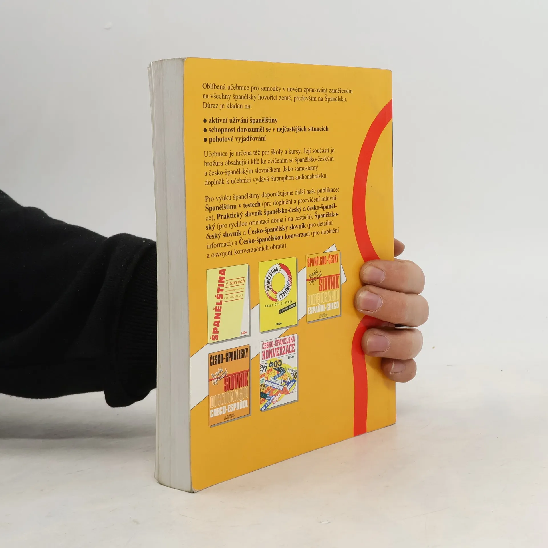 Oblíbená učebnice pro samouky v novém zpracování zaměřené na všechny španělsky hovořící země, především na Španělsko. Důraz je kladen na: . aktivní užívání španělštiny . schopnost dorozumět se v nejčastějších situacích . pohotové vyjadřování Učebnice je určena též pro školy a kursy. Její součástí je brožura obsahující klíč ke cvičením (119 s.) se španělsko-českým a česko-španělským slovníčkem. Jako samostatný doplněk k učebnici vydává Supraphon audionahrávku.