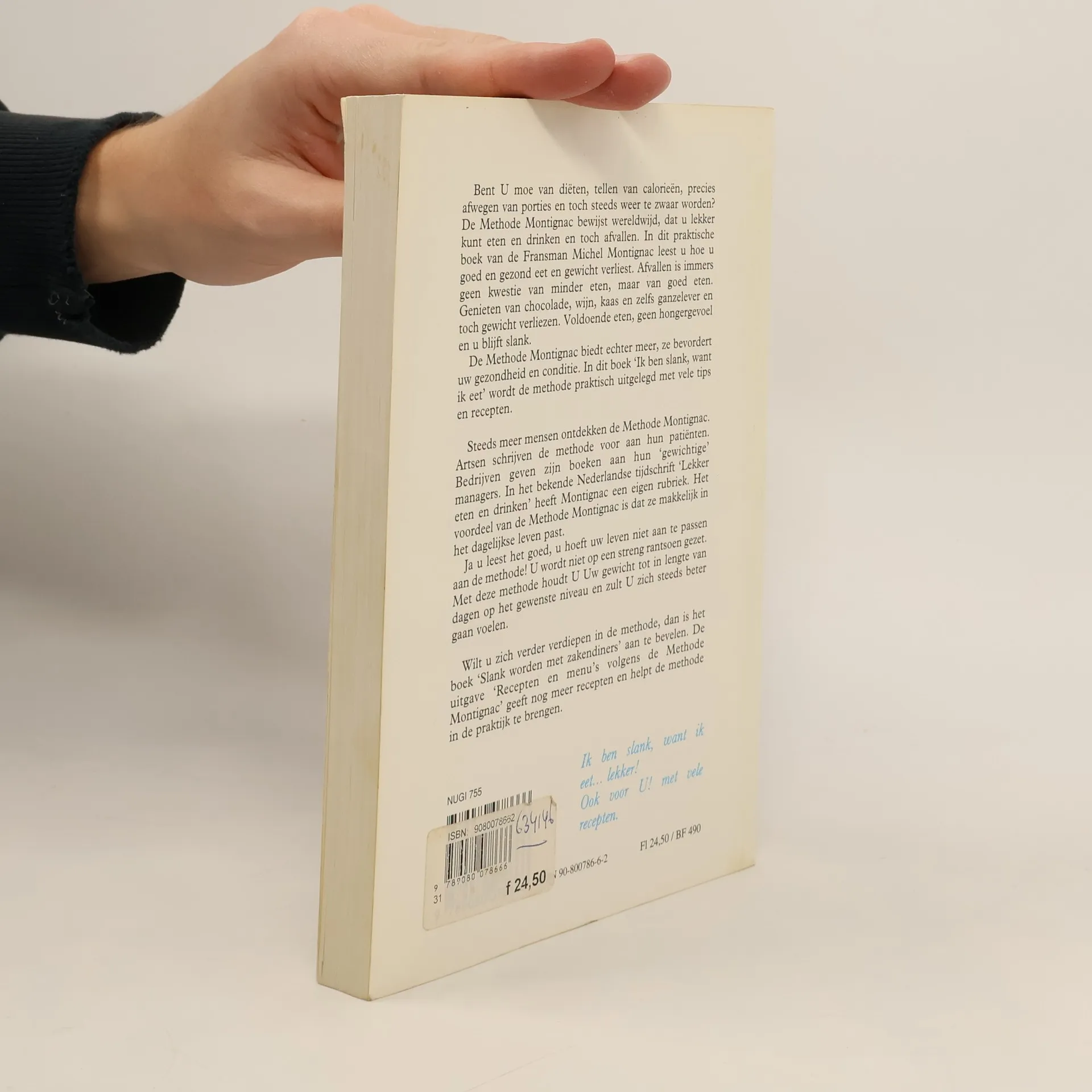 Bent U moe van diëten, tellen van calorieën, precies afwegen van porties en toch steeds weer te zwaar worden? De Methode Montignac bewijst werelwijd, dat u lekker kunt eten en drinken en toch afvallen. In dit praktische boek van de Fransman Michel Montignac leest u hoe u goed en gezond eet en gewicht verliest. Afvallen is immers geen kwestie van minder eten, maar van goed eten. Genieten van chocolade, wijn, kaas en zelfs ganzelever en toch gewicht verliezen. Voldoende eten, geen hongergevoel en u blijft slank. De Methode Montignac biedt echter meer, ze bevordert uw gezondheid en conditie. In dit boek "Ik ben slank want ik eet" wordt de methode praktisch uitglegd met vele tips en recepten. Steeds meer mensen ontdekken de Methode Montignac. Artsen schrijven de methode voor aan hun patiënten. Bedrijven geven zijn boeken aan hun 'gewichtige' managers. In het bekende Nederlandse tijdschrijft 'Lekker eten en drinken' heeft Montignac een eigen rubriek. Het voordeel van de methode Montignac is dat ze makkelijk in het dagelijkse leven past. Ja u leest het goed, u hoeft uw leven niet aan te passen aan de methode! U wordt niet op een streng rantsoen gezet. Met deze methode houdt U Uw gewicht tot in lengte van dagen op het gewenste nieveau en zult U zich steeds beter gaan voelen.