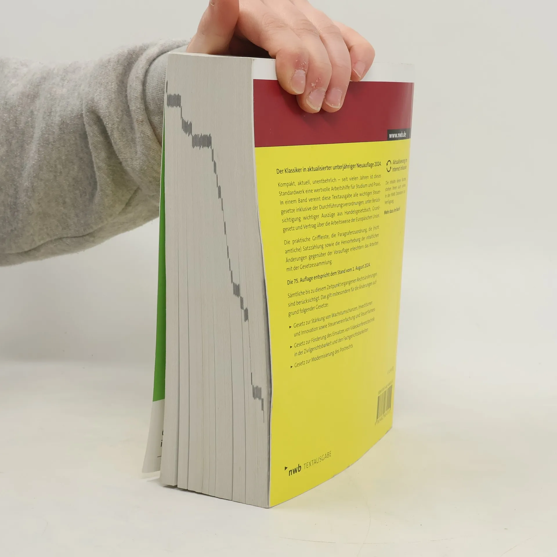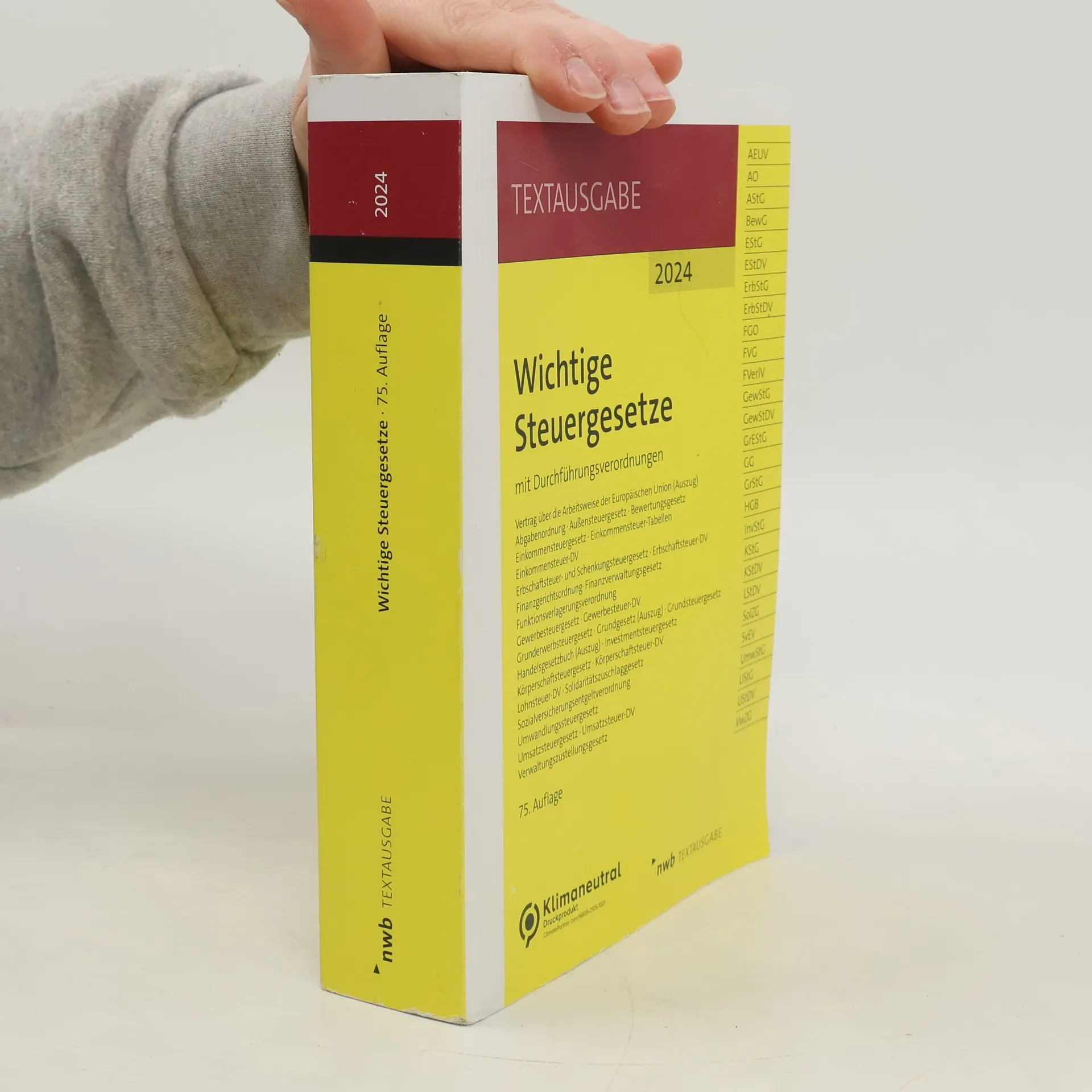 Dieses Standardwerk bietet eine kompakte und aktuelle Sammlung aller wichtigen Steuergesetze und relevanter Vorschriften in einem Band. Die 74. Auflage 2024 berücksichtigt alle Rechtsänderungen bis zum 1. Januar 2024 und ist eine unverzichtbare Hilfe für Studium und Praxis, ergänzt durch praktische Arbeitsmittel.