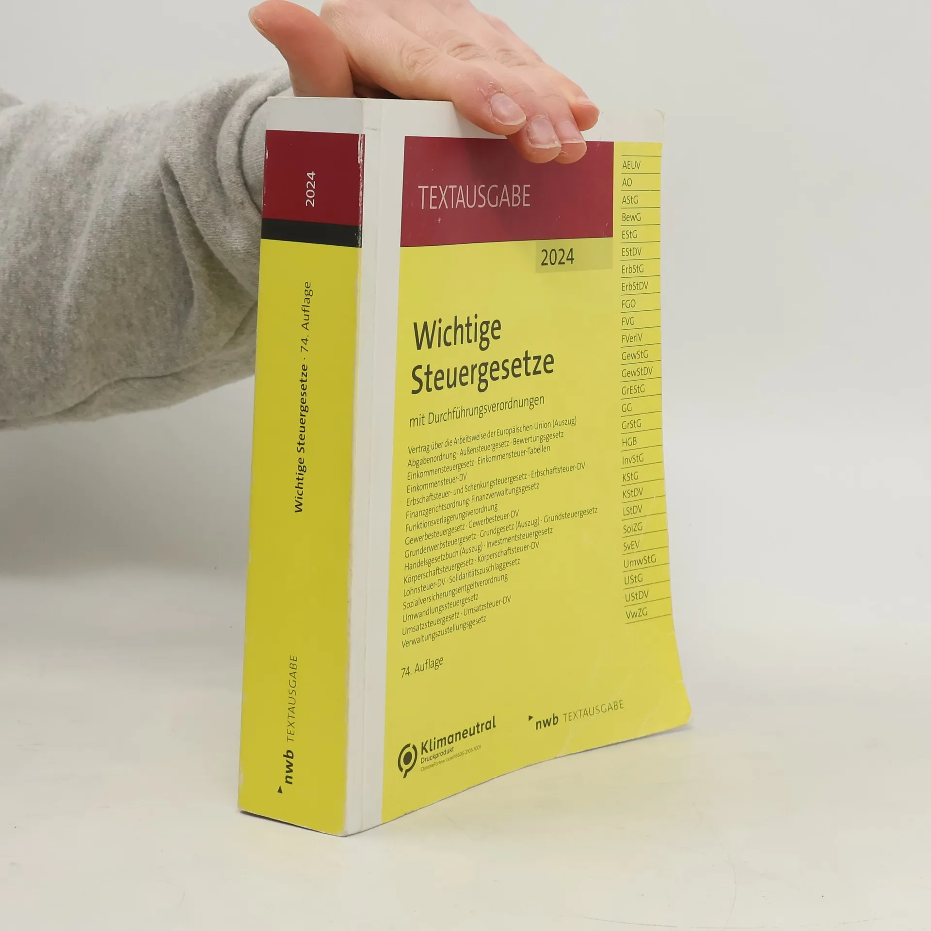 Dieses Standardwerk bietet eine kompakte und aktuelle Sammlung aller wichtigen Steuergesetze und relevanter Vorschriften in einem Band. Die 74. Auflage 2024 berücksichtigt alle Rechtsänderungen bis zum 1. Januar 2024 und ist eine unverzichtbare Hilfe für Studium und Praxis, ergänzt durch praktische Arbeitsmittel.