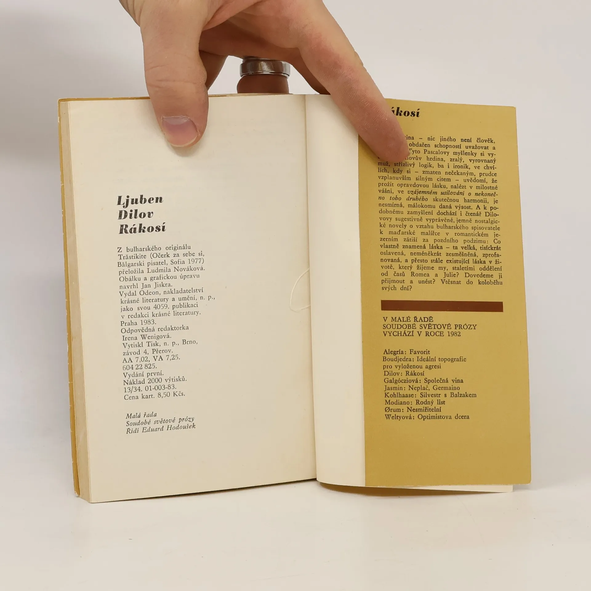 Rákosí - křehká třtina - nic jiného není člověk, třebaže je obdařen schopností uvažovat a mluvit... Tyto Pascalovy myšlenky si vybavuje Dilovův hrdina, zralý, vyrovnaný muž, střízlivý logik ba i ironik, ve chvílích, kdy si - zmaten nečekaným, prudce vzplanuvším citem - uvědomí, že prožít opravdovou lásku, nalézt v milostné vášni, ve vzájemném usilování o nekonečno toho druhého skutečnou harmonii, je nesmírná, málokomu daná výsost. A k podobnému zamyšlení dochází i čtenář Dilovovy sugestivně vyprávěné, jemně nostalgické novely o vztahu bulharského spisovatele k maďarské malířce, kteří si díky jazykové bariéře nerozumí, ale přesto spolu souzní.
