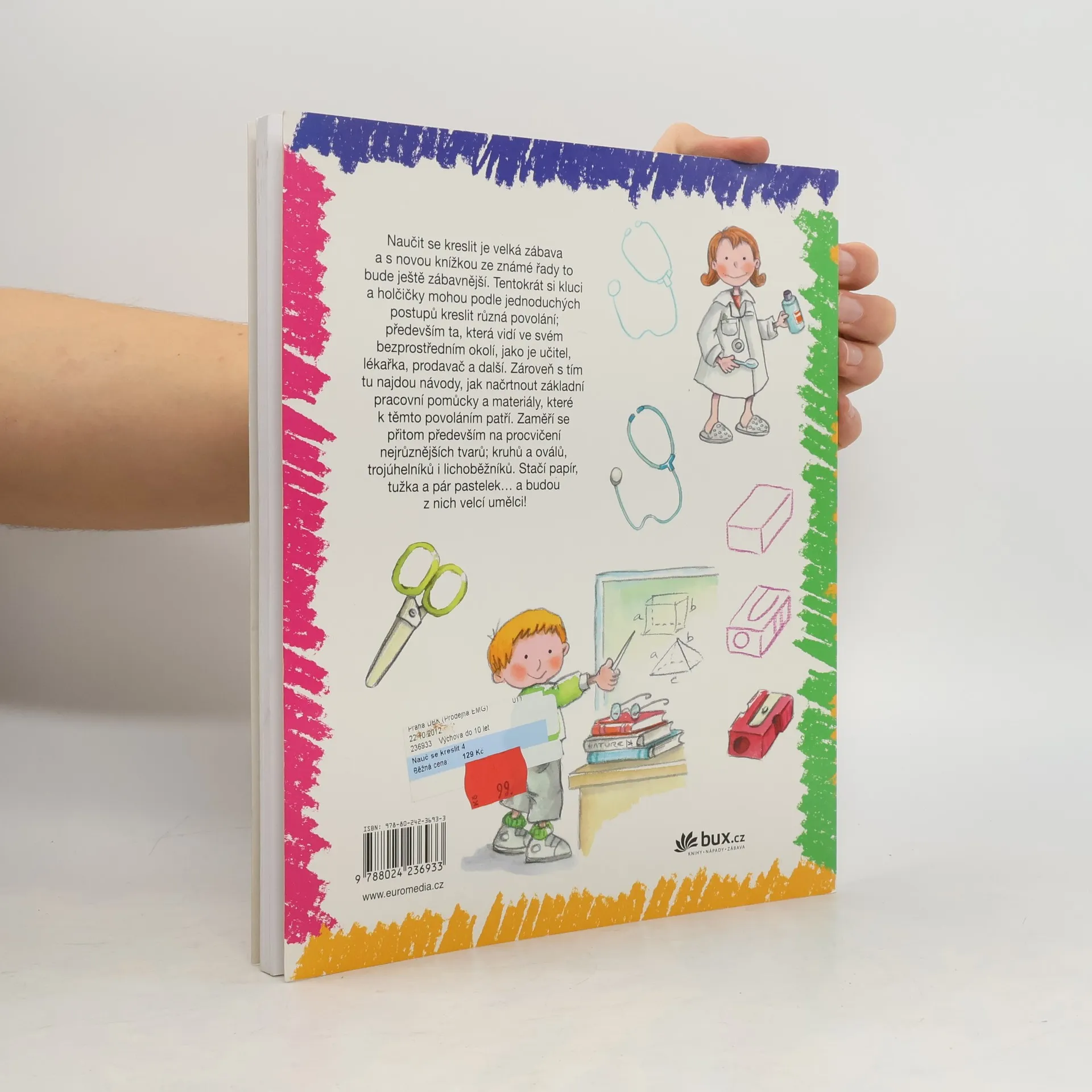 Nauč se kreslit 4. Nauč se kreslit krok za krokem, jak lidé pracují. Naučit se kreslit je velká zábava a s novou knížkou ze známé řady to bude ještě zábavnější. Tentokrát si kluci a holčičky mohou podle jednoduchých postupů kreslit různá povolání; především ta, která vidí ve svém bezprostředním okolí, jako je učitel, lékařka, prodavač a další. Zároveň s tím tu najdou návody, jak načrtnout základní pracovní pomůcky a materiály, které k těmto povoláním patří. Zaměří se přitom především na procvičení nejrůznějších tvarů; kruhů a oválů, trojúhelníků i lichoběžníků. Stačí papír, tužka a pár pastelek… a budou z nich velcí umělci!