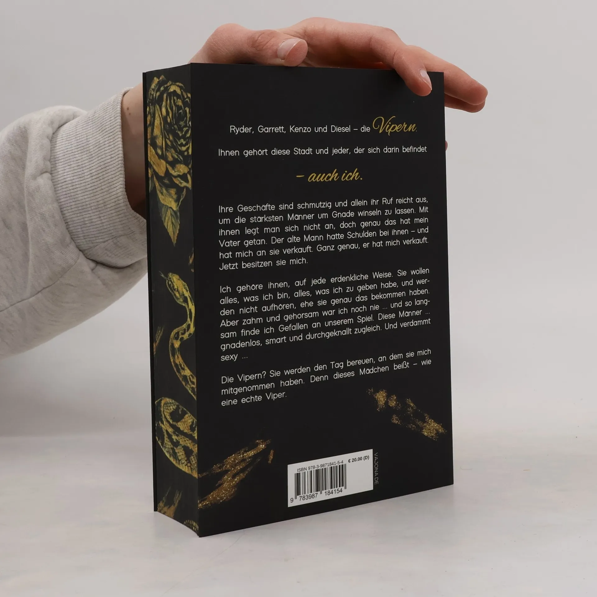 Ryder, Garrett, Kenzo und Diesel - die Vipern. Ihnen gehört diese Stadt und jeder, der sich darin befindet - auch ich. Ihre Geschäfte sind schmutzig und allein ihr Ruf reicht aus, um die stärksten Männer um Gnade winseln zu lassen. Mit ihnen legt man sich nicht an, doch genau das hat mein Vater getan. Der alte Mann hatte Schulden bei ihnen - und hat mich an sie verkauft. Ganz genau, er hat mich verkauft. Jetzt besitzen sie mich. Ich gehöre ihnen, auf jede erdenkliche Weise. Sie wollen alles, was ich bin, alles, was ich zu geben habe, und werden nicht aufhören, ehe sie genau das bekommen haben. Aber zahm und gehorsam war ich noch nie ... und so langsam finde ich Gefallen an unserem Spiel. Diese Männer ... gnadenlos, smart und durchgeknallt zugleich. Und verdammt sexy ... Die Vipern? Sie werden den Tag bereuen, an dem sie mich mitgenommen haben. Denn dieses Mädchen beißt - wie eine echte Viper.