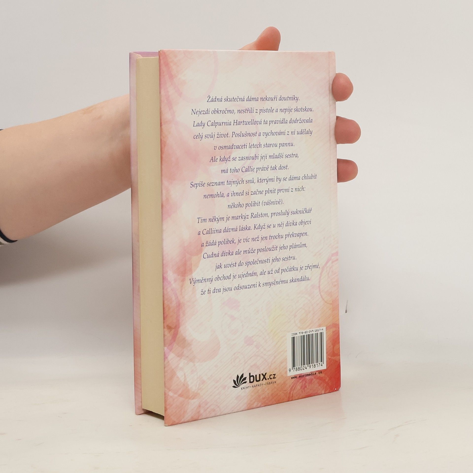 První kniha ze série historických romancí nové autorky. Žádná skutečná dáma nekouří doutníky, nejezdí obkročmo, nestřílí z pistole a nepije skotskou. Lady Calpurnia Hartwellová ta pravidla dodržovala celý svůj život. Poslušnost a vychování z ní udělaly v osmadvaceti letech starou pannu. Ale když se zasnoubí její mladší sestra, má toho Callie právě tak dost. Sepíše seznam tajných snů, kterými by se dáma chlubit nemohla, a ihned si začne plnit první z nich: políbit markýze Ralstona.