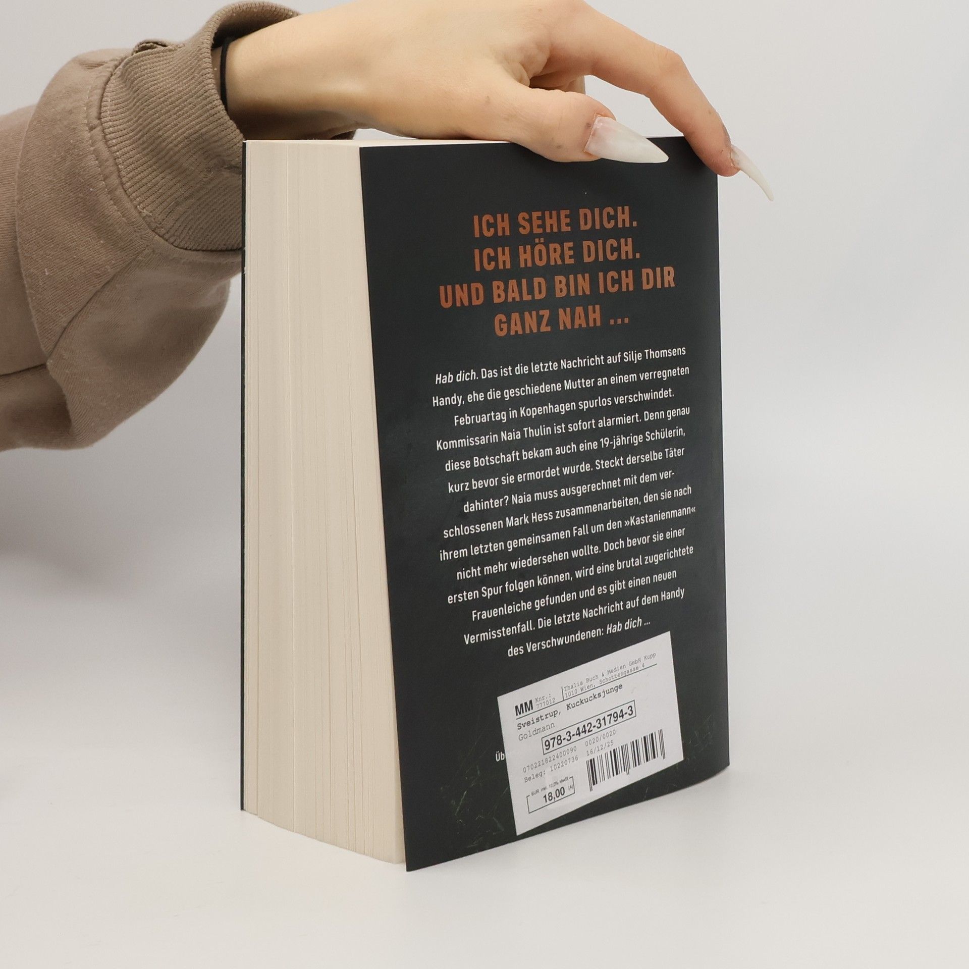 Ich sehe dich. Ich höre dich. Und dann bin ich dir ganz nah ... Hab dich. Das ist die letzte Nachricht auf Silje Thomsens Handy, ehe die geschiedene Mutter an einem verregneten Februartag in Kopenhagen spurlos verschwindet. Kommissarin Naia Thulin ist sofort alarmiert. Denn genau diese Botschaft bekam auch eine 19-jährige Schülerin, kurz bevor sie ermordet wurde. Steckt derselbe Täter dahinter? Naia muss ausgerechnet mit dem verschlossenen Mark Hess zusammenarbeiten, den sie nach ihrem letzten gemeinsamen Fall um den „Kastanienmann“ nicht mehr wiedersehen wollte. Doch bevor sie einer ersten Spur folgen können, wird eine brutal zugerichtete Frauenleiche gefunden – und es gibt einen neuen Vermisstenfall. Die letzte Nachricht auf dem Handy des Vermissten: Hab dich …