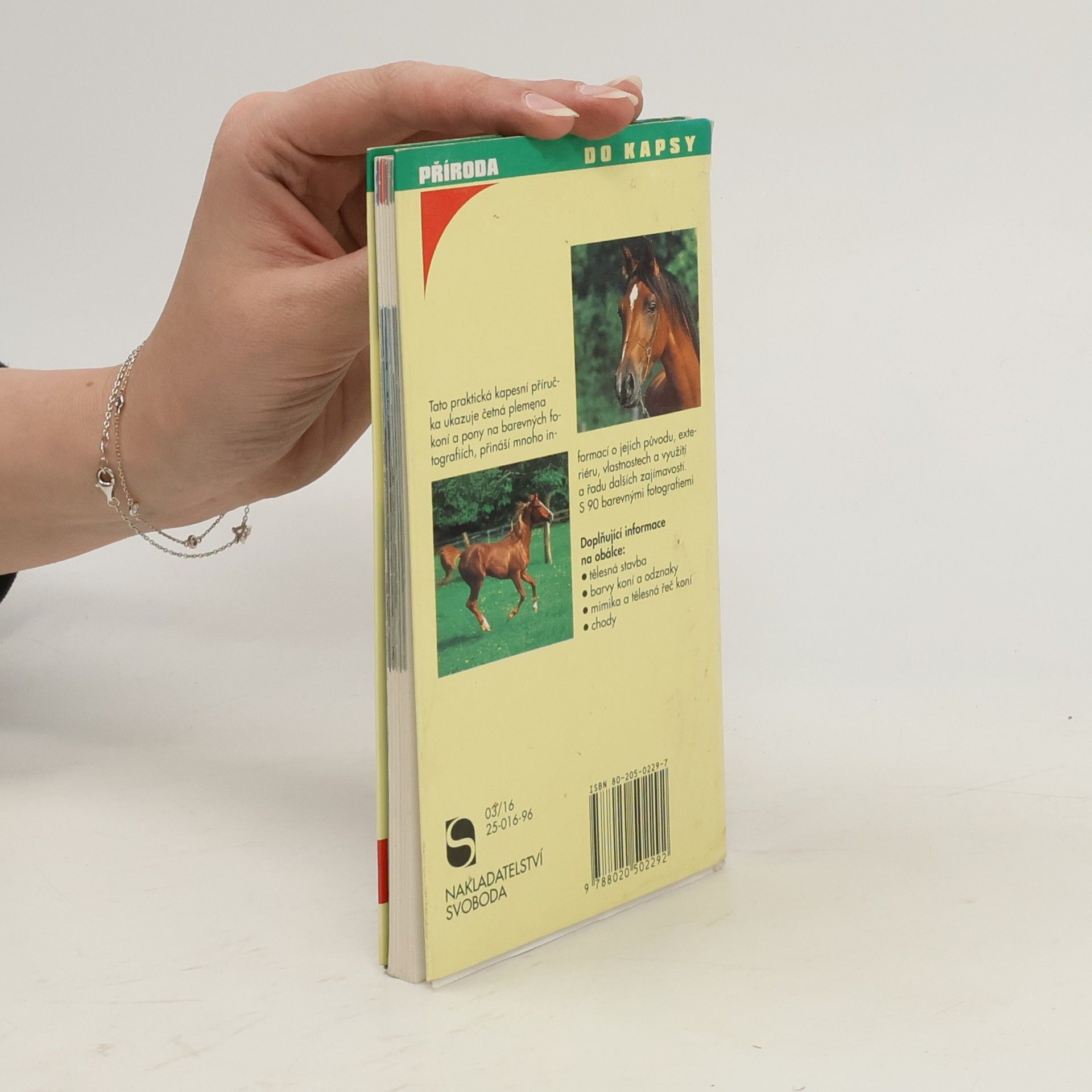 Tato praktická kapesní příručka ukazuje četná plemena koní a pony na barevných fotografiích, přináší mnoho informací o jejich původu, exteriéru, vlastnostech a využití a řadu dalších zajímavostí. S 90 barevnými fotografiemi. Doplňující informace na obálce: tělesná stavba, barvy koní a odznaky, mimika a tělesná řeč koní, chody.