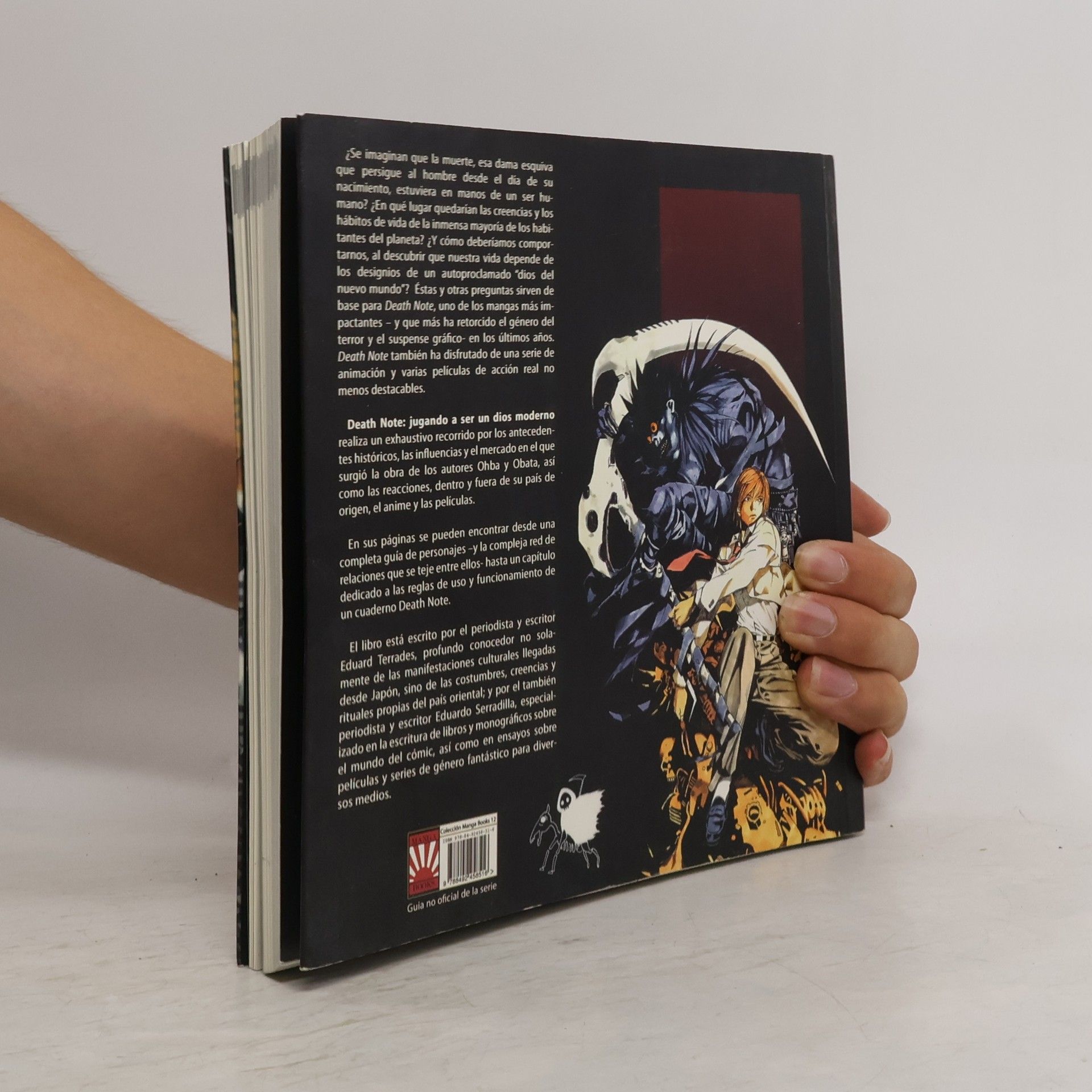 Death Note: jugando a ser un dios moderno realiza un exhaustivo recorrido por los antecedentes históricos, las influencias y el mercado en el que surgió la obra de los autores Ohba y Obata, así como las reacciones, dentro y fuera de su país de origen, el anime y las películas. En sus páginas se pueden encontrar desde una completa guía de personajes -y la compleja red de relaciones que se teje entre ellos- hasta un capítulo dedicado a las reglas de uso y funcionamiento de un cuaderno Death Note. El libro está escrito por el periodista y escritor Eduard Terrades, profundo conocedor no solamente de las manifestaciones culturales llegadas desde Japón, sino de las costumbres, creencias y rituales propias del país oriental; y por el también periodista y escritor Eduardo Serradilla, especializado en la escritura de libros y monográficos sobre el mundo del cómic, así como en ensayos sobre películas y series de género fantástico para diversos medios.