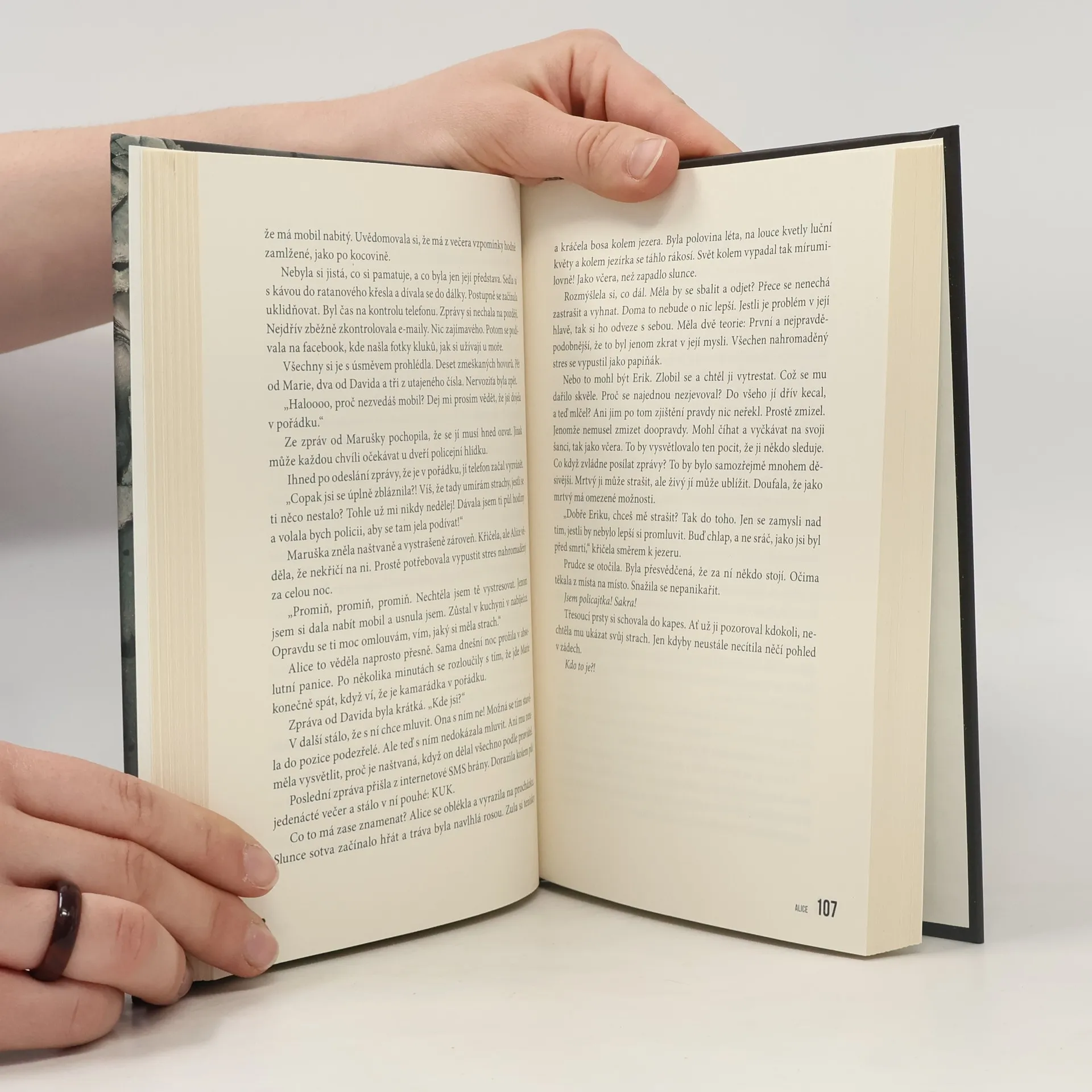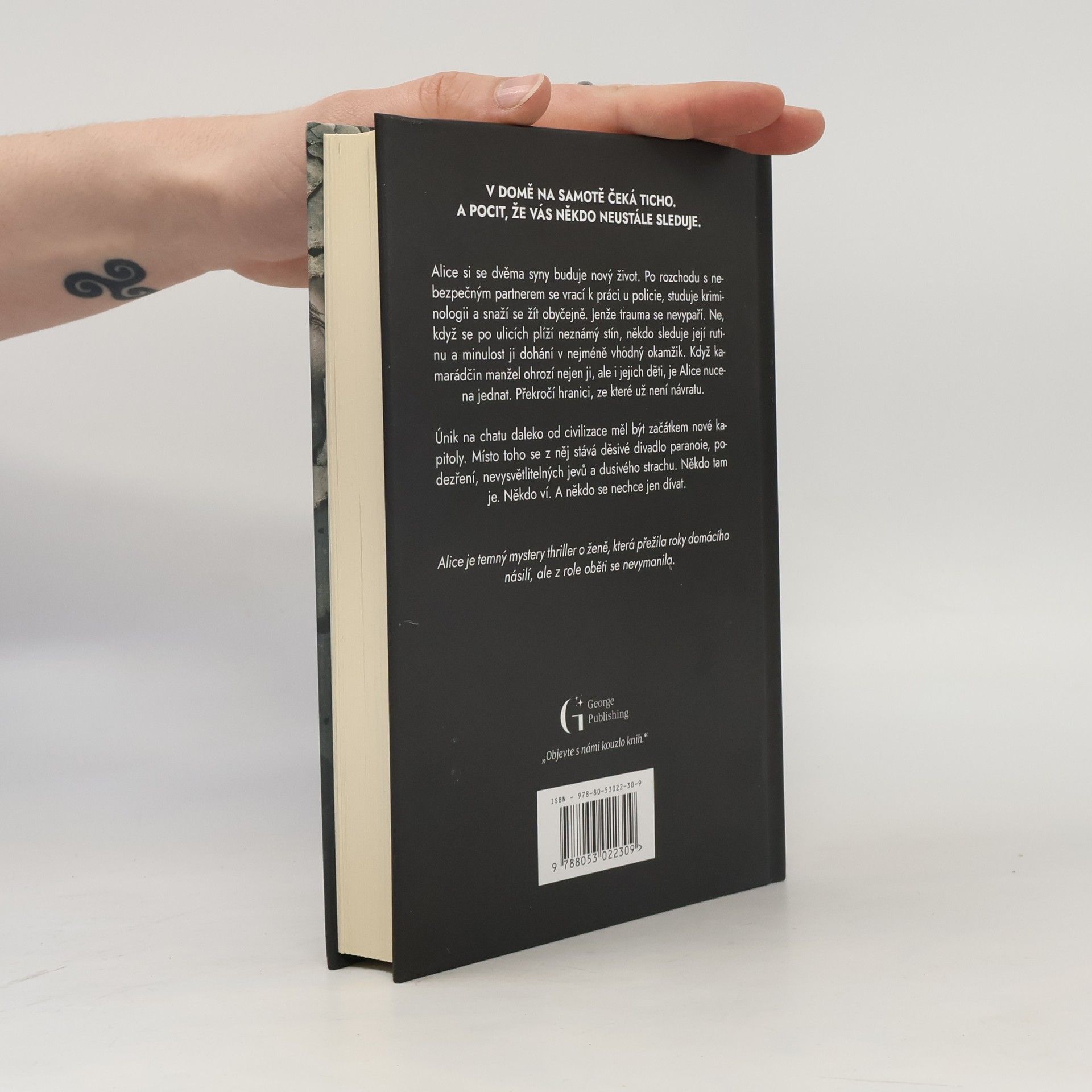 V domě na samotě čeká ticho. A pocit, že vás někdo neustále sleduje. Alice si s dvěma syny buduje nový život. Po rozchodu s nebezpečným partnerem se vrací k práci u policie, studuje kriminologii a snaží se žít obyčejně. Jenže trauma se nevypaří. Ne když se po ulicích plíží neznámý stín, někdo sleduje její rutinu a minulost ji dohání v nejméně vhodný okamžik.Když kamarádčin manžel ohrozí nejen ji, ale i jejich děti je Alice nucena jednat.Překročí hranici ze které už není návratu. Únik na chatu daleko od civilizace měl být začátkem nové kapitoly. Místo toho se z něj stává děsivé divadlo paranoie, podezření, nevysvětlitelných jevů a dusivého strachu. Někdo tam je. Někdo ví. A někdo se nechce jen dívat. Alice je temný mystery thriller o ženě, která přežila roky domácího násilí, ale z role oběti se nevymanila.