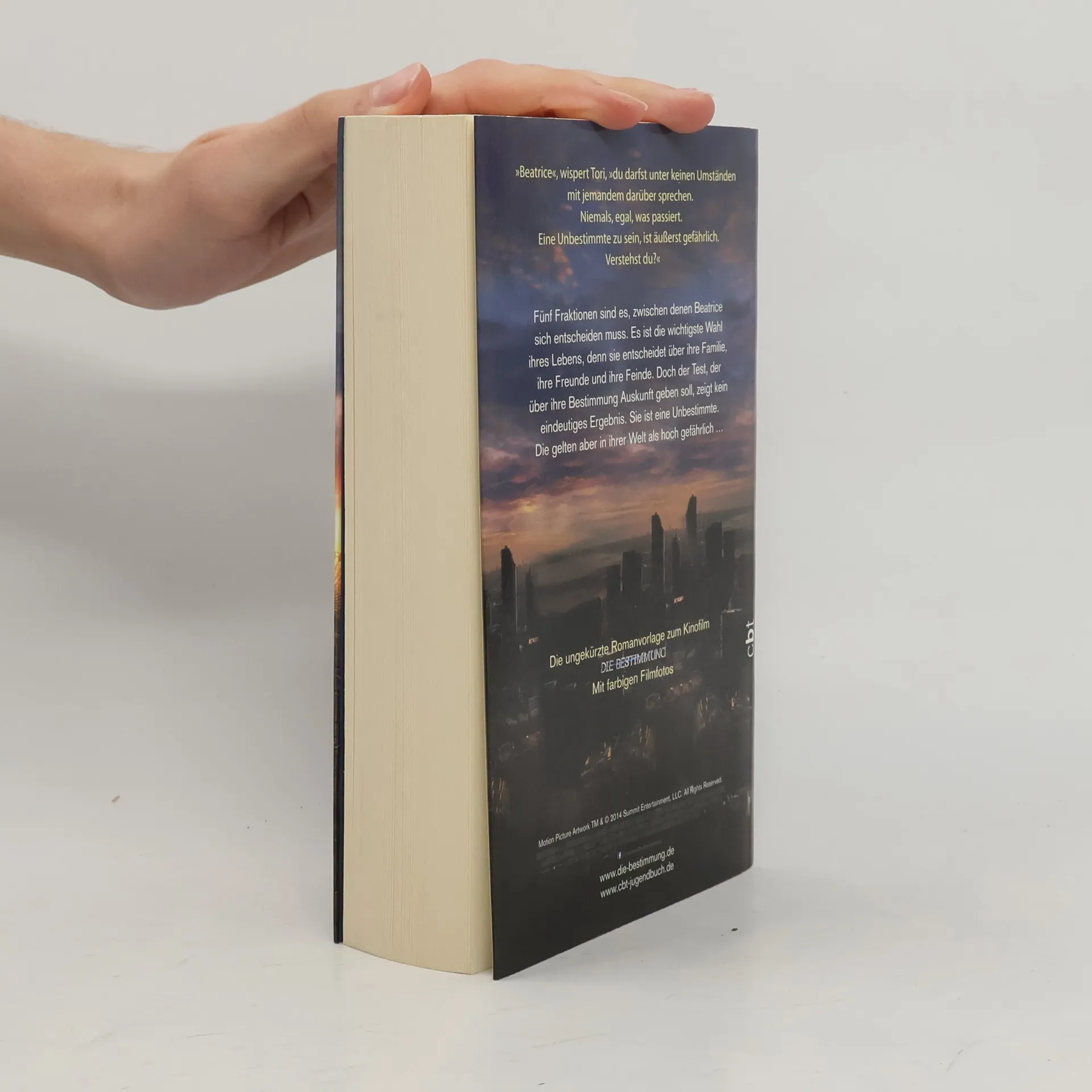 Die packende Romanvorlage zur großen Verfilmung Altruan – die Selbstlosen. Candor – die Freimütigen. Ken – die Wissenden. Amite – die Friedfertigen. Und Ferox – die Furchtlosen … Fünf Fraktionen, fünf verschiedene Lebensformen sind es, zwischen denen Beatrice wählen muss. Ihre Entscheidung wird ihr gesamtes künftiges Leben bestimmen, denn die Fraktion, der sie sich anschließt, gilt fortan als ihre Familie. Doch der Test, der über Beatrices innere Bestimmung Auskunft geben soll, zeigt kein eindeutiges Ergebnis. Sie ist eine Unbestimmte. Die aber gelten in ihrer Welt als hoch gefährlich ... Ausstattung: Mit farbigen Filmfotos