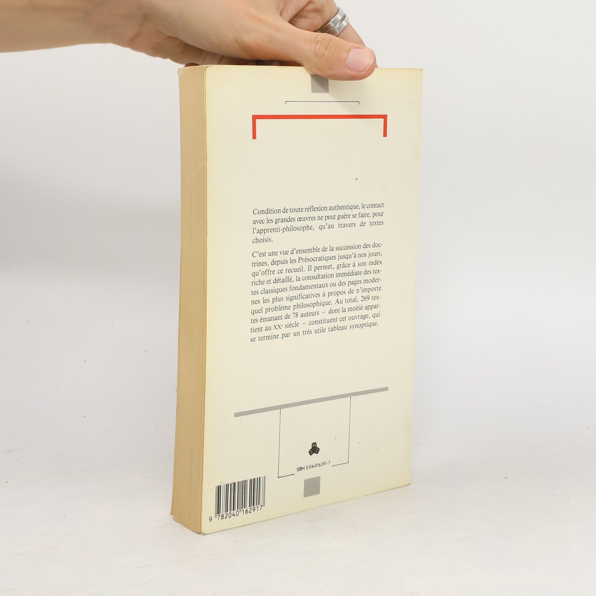 Condition de toute réflexion authentique, le contact avec les grandes œuvres ne peut guère se faire, pour l'apprenti philosophe, qu'au travers de textes choisis. C'est une vue d'ensemble de la succession des doctrines, depuis les Présocratiques jusqu'à nos jours, qu'offre ce recueil. Il permet, grâce à son index riche et détaillé, la consultation immédiate des textes classiques fondamentaux ou des pages modernes les plus significatives à propos de n'importe quel problème philosophique. Au total 269 textes émanant de 78 auteurs. - dont la moitié appartient au XXe siècle - constituent cet ouvrage, qui se termine par un très utile table synoptique.