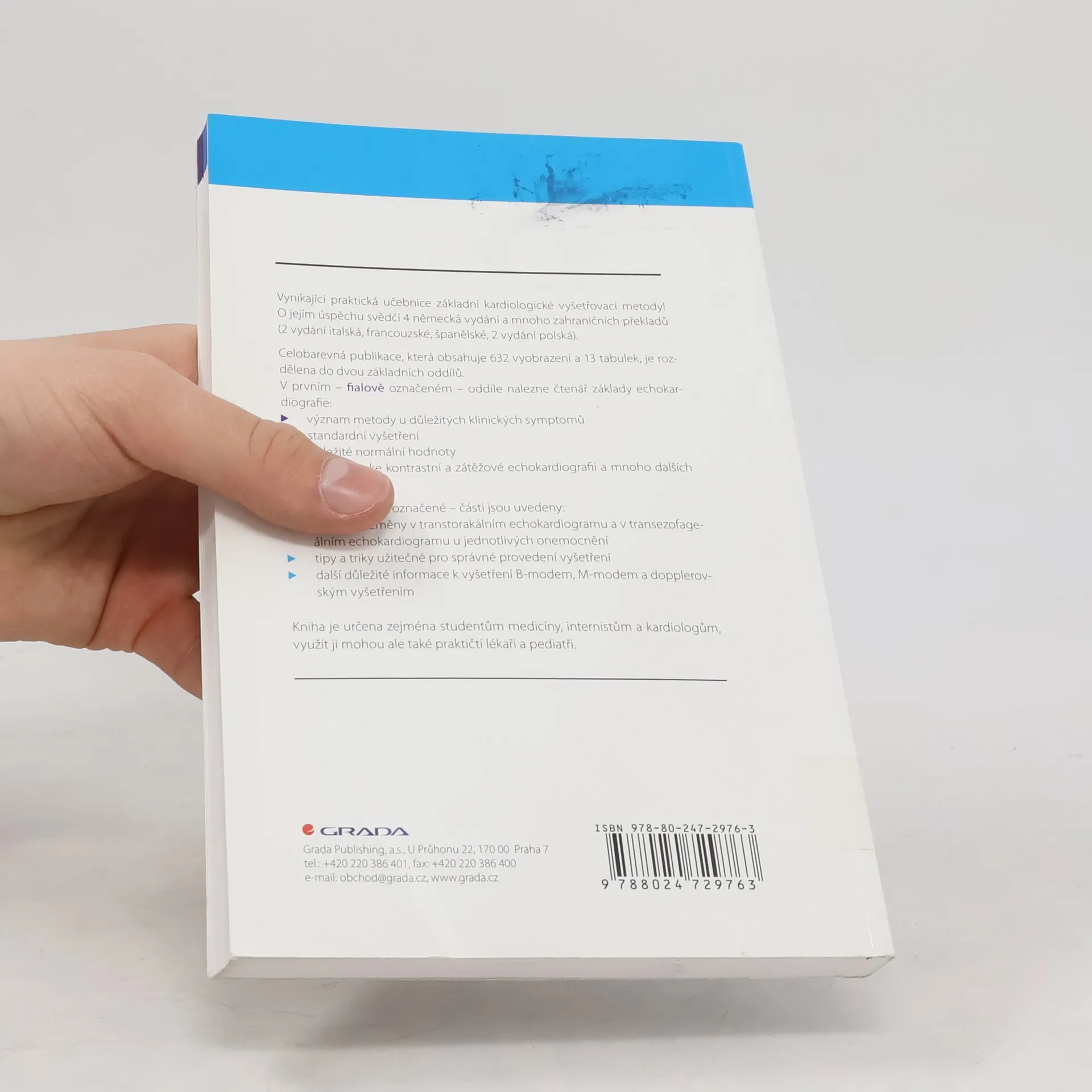 Vynikající praktická učebnice základní kardiologické vyšetřovací metody! O jejím úspěchu svědčí 4 německá vydání a mnoho zahraničních překladů. Celobarevná publikace, která obsahuje 632 vyobrazení, je rozdělena do dvou oddílů. První oddíl shrnuje základy echokardiografie: význam metody u důležitých klinických symptomů, standardní vyšetření, důležité normální hodnoty, informace ke kontrastní a zátěžové echokardiografii apod. Ve druhé části jsou uvedeny: orgánové změny v transtorakálním a v transezofageálním echokardiogramu u jednotlivých onemocnění, tipy a triky užitečné pro správné provedení vyšetření i další důležité informace k vyšetření B-modem, M-modem a dopplerovským vyšetřením.
