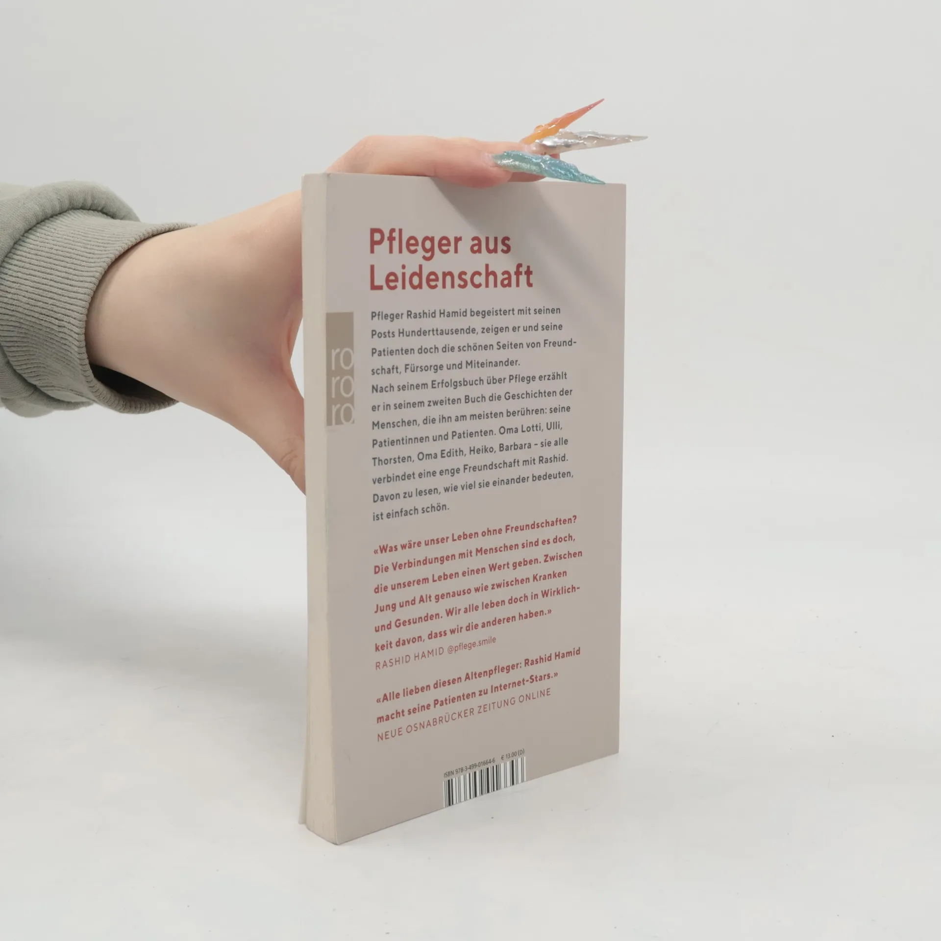 Der wohl beliebteste Pfleger Deutschlands Rashid Hamid hat mit seinem ersten Buch «Ein Herz und eine Pflege» zahlreiche Menschen begeistert – und gezeigt, was seinen Alltag als Pfleger zu etwas ganz Besonderem macht. In seinem zweiten Buch erzählt der sympathische Hamburger die Geschichten der Menschen, vor denen er am meisten Respekt hat: seinen Patientinnen und Patienten. Oma Lotti, Heiko, Thorsten, Barbara, Uli, Oma Edith – sie alle sind ihm wichtig, und ihre Geschichten verdienen es, erzählt zu werden. Aus Sicht Rashids, der sicher ist: Freundschaft kennt kein Alter. Ein Buch, das die positiven Seiten des Lebens feiert und zeigt, wie zwischenmenschliche Werte wie Freundschaft und Vertrauen Alter und Krankheit besiegen – und eine Community begeistern können, die ihren Helden viel zurückgibt. @pflege.smile