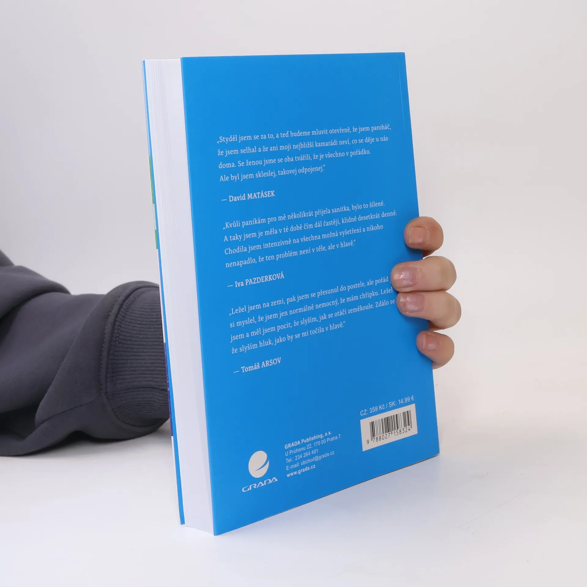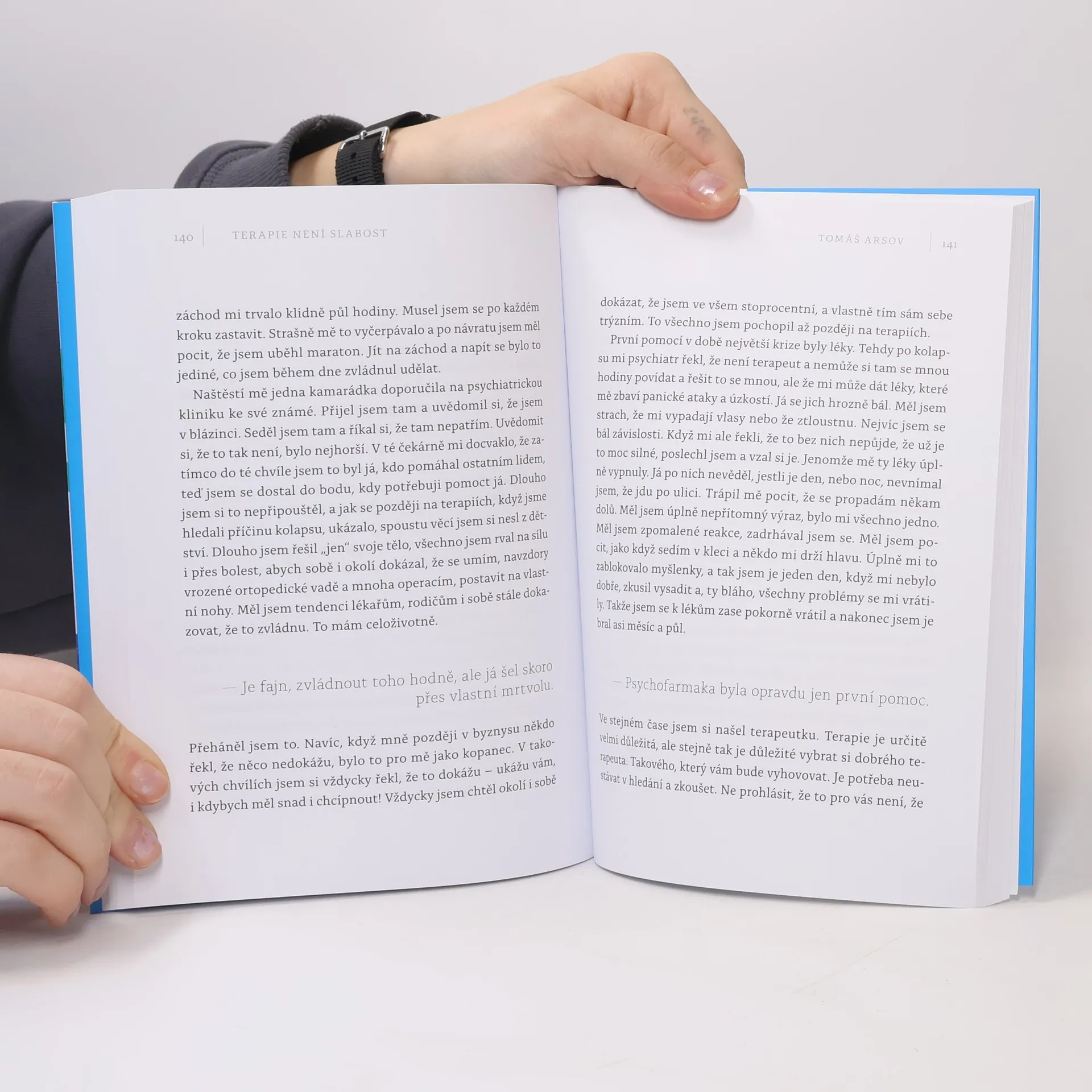 Jaké to je, když hlava zatáhne za záchrannou brzdu a znemožní tělu fungovat, moc dobře ví David Matásek, který začal chodit na terapie kvůli potížím ve vztahu, tanečnice Lenka Nora Návorková potřebovala vyřešit trápení z dětství nebo chirurg Tomáš Šebek, který chtěl vylepšit sám sebe. Paralympionik Jaroslav Petrouš by tu bez povídání s psychiatrem možná už nebyl a špičkového kadeřníka Tomáše Arsova vyřadily psychické problémy z provozu na dlouhé týdny. Spisovatelce Markétě Lukáškové zase život dlouhé roky komplikovalo nediagnostikované ADHD a Iva Pazderková se potýkala s panickou atakou, která jí i několikrát denně navozovala pocit, že umírá.... V knize terapie není slabost najdete celkem 15 otevřených zpovědí o cestě za duševním zdravím.