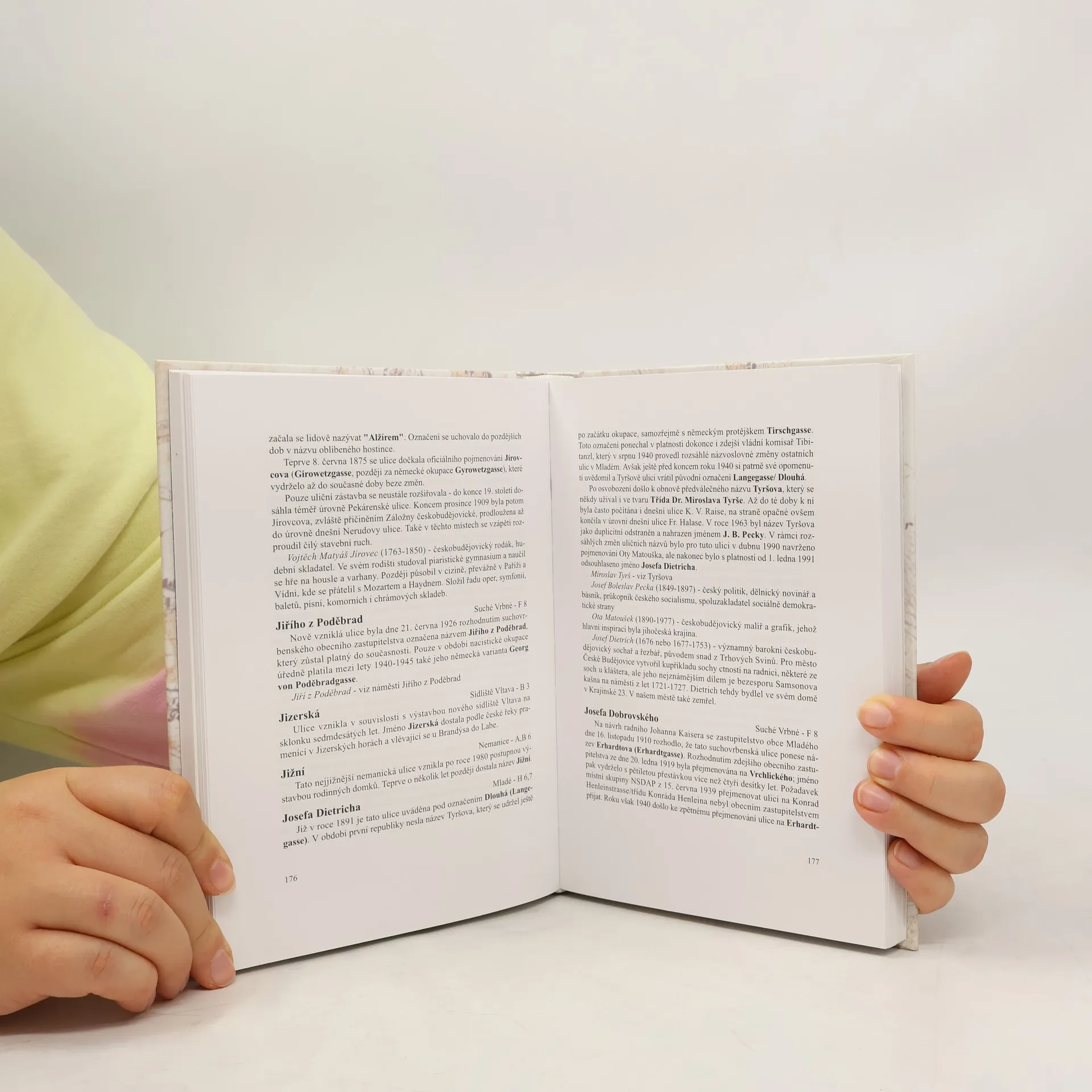 Podtitul: Názvy českobudějovických veřejných prostranství v minulosti a dnes Hlavní součást knihy tvoří údaje o jednotlivých veřejných prostranstvích. Tato část eviduje 400 stávajících, 8 zaniklých a 4 nerealizované českobudějovické ulice, 10 existujících a 13 zrušených náměstí, 7 nábřeží a 9 mostů. Ke každému článku je připojena informace o osobnosti , po níž ulice či náměstí nese jméno. Zde autoři preferovali princip regionality, čtenář se dozví nejvíce o lidech se vztahem k jižním Čechám. Na konci knihy je připojen abecední rejstřík, který odkazuje na současné platné názvy. Kniha je uvedena pojednáním o proměnách českobudějovického uličního názvosloví v průběhu dějin města a o územním vývoji města. 2., dopl. a přeprac. vyd.