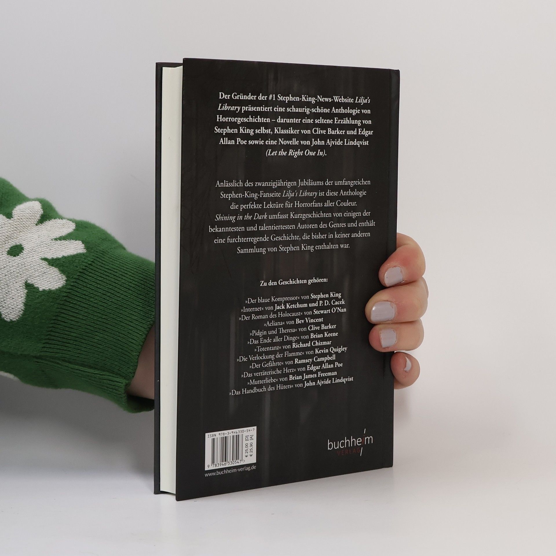 Der Gründer der #1 Stephen-King-News-Website Lilja’s Library präsentiert eine schaurig-schöne Anthologie von Horrorgeschichten – darunter eine seltene Erzählung von Stephen King selbst, Klassiker von Clive Barker und Edgar Allan Poe sowie eine Novelle von John Ajvide Lindqvist (Let the Right One In).Anlässlich des zwanzigjährigen Jubiläums der umfangreichen Stephen-King-Fanseite »Lilja's Library - The World of Stephen King« ist diese Anthologie die perfekte Lektüre für Horrorfans aller Couleur.Shining in the Dark umfasst Kurzgeschichten von einigen der bekanntesten und talentiertesten Autoren des Genres und enthält eine furchterregende Geschichte, die bisher in keiner anderen Sammlung von Stephen King enthalten war.Zu den Geschichten gehören:»Der blaue Kompressor« von Stephen King»Internet« von Jack Ketchum und P. D. Cacek»Der Roman des Holocaust« von Stewart O’Nan»Aeliana« von Bev Vincent»Pidgin und Theresa« von Clive Barker»Das Ende aller Dinge« von Brian Keene»Totentanz« von Richard Chizmar»Die Verlockung der Flamme« von Kevin Quigley»Der Gefährte« von Ramsey Campbell»Das verräterische Herz« von Edgar Allan Poe»Mutterliebe« von Brian James Freeman»Das Handbuch des Hüters« von John Ajvide Lindqvist