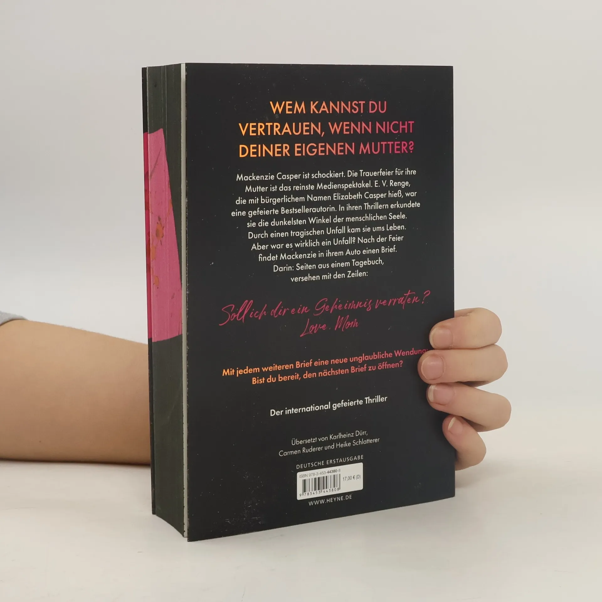 Wem kannst du vertrauen, wenn nicht deiner eigenen Mutter? Mit Farbschnitt in limitierter Erstauflage – Lieferung je nach Verfügbarkeit Studentin Mackenzie Casper hat stets im Schatten ihrer berühmten Mutter Elizabeth gelebt, einer der bekanntesten Thriller-Autorinnen der Welt. Doch jetzt ist Elizabeth tot. Mackenzie ist nicht die Einzige die Zweifel daran hat, dass es ein tragischer Unfall war. Auf der Trauerfeier erhält sie einen mysteriösen Brief mit Seiten aus dem Tagebuch ihrer Mutter. Weitere Briefe folgen. Hatte ihre Mom Geheimnisse, die sie das Leben kosteten? Um das herauszufinden, muss Mackenzie selbst Nachforschungen anstellen. Dabei darf sie niemandem trauen. Vor allem nicht ihrer Familie.