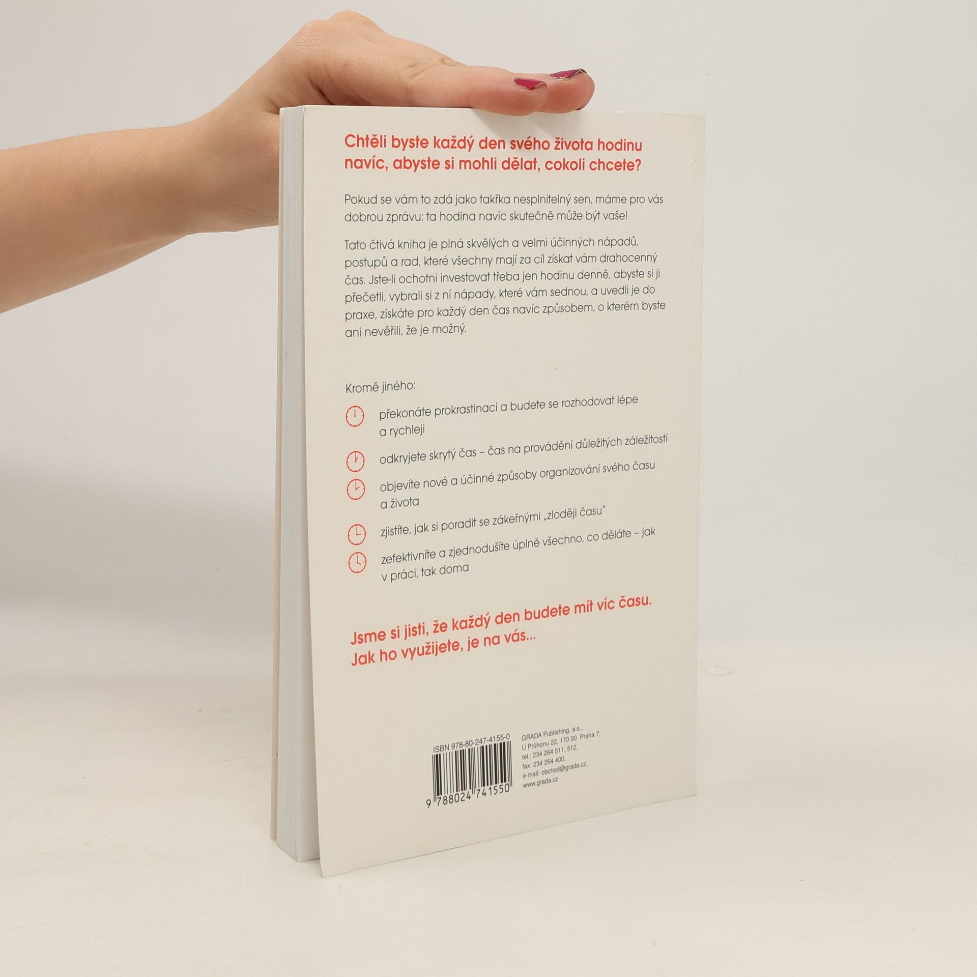 Chtěli byste každý den svého života hodinu navíc, abyste si mohli dělat, cokoli chcete? Pokud se vám to zdá jako takřka nesplnitelný sen, máme pro vás dobrou zprávu: ta hodina navíc skutečně může být vaše! Tato čtivá kniha je plná skvělých a velmi účinných nápadů, postupů a rad, které všechny mají za cíl získat vám drahocenný čas. Jste-li ochotni investovat třeba jen hodinu denně, abyste si ji přečetli, vybrali si z ní nápady, které vám sednou, a uvedli je do praxe, získáte pro každý den čas navíc způsobem, o kterém byste ani nevěřili, že je možný.Kromě jiného: překonáte prokrastinaci a budete se rozhodovat lépe a rychleji; odkryjete skrytý čas - čas na provádění důležitých záležitostí; objevíte nové a účinné způsoby organizování svého času a života; zjistíte, jak si poradit se zákeřnými „zloději času“;zefektivníte a zjednodušíte úplně všechno, co děláte - jak v práci, tak doma. Jsme si jisti, že každý den budete mít víc času. Jak ho využijete, je na vás...