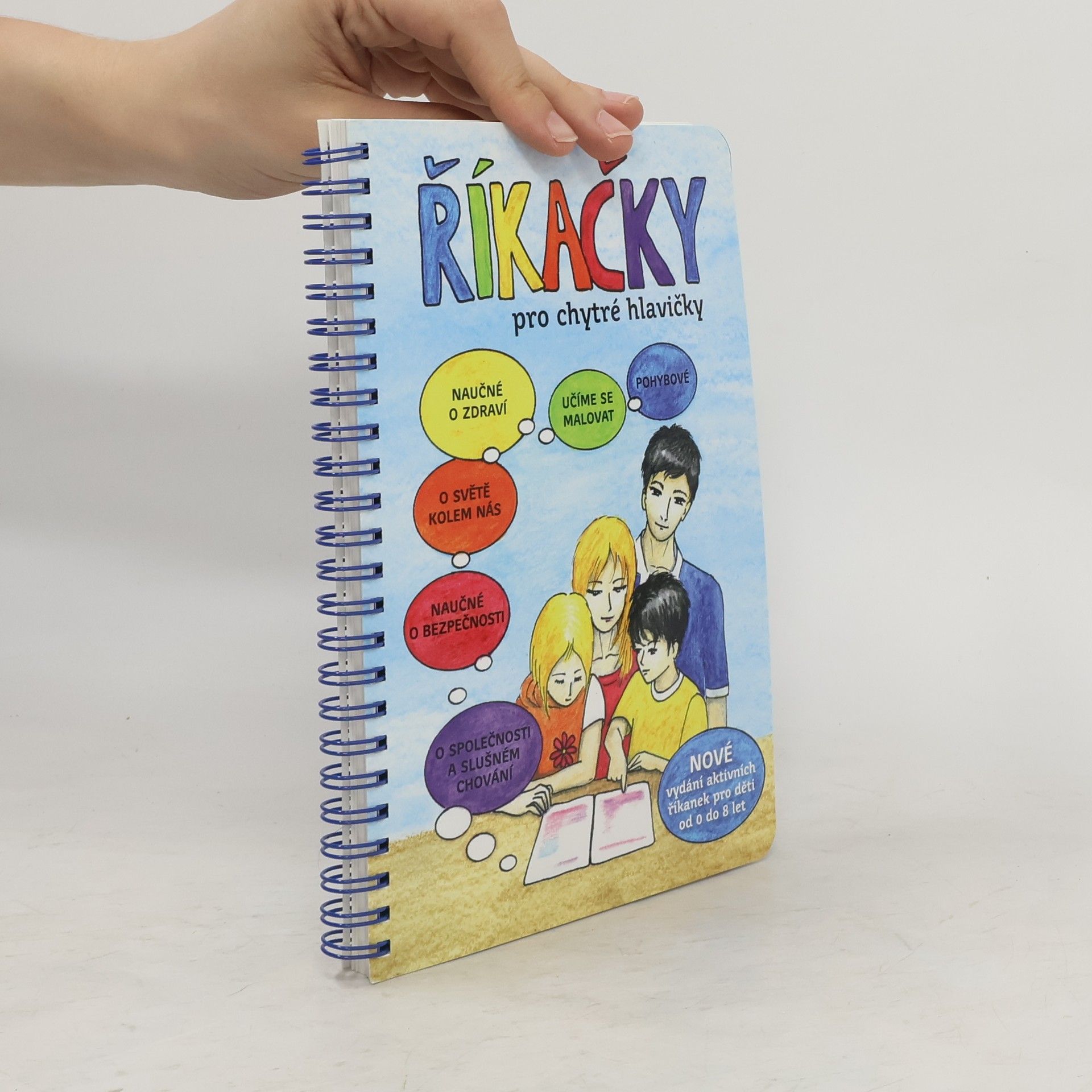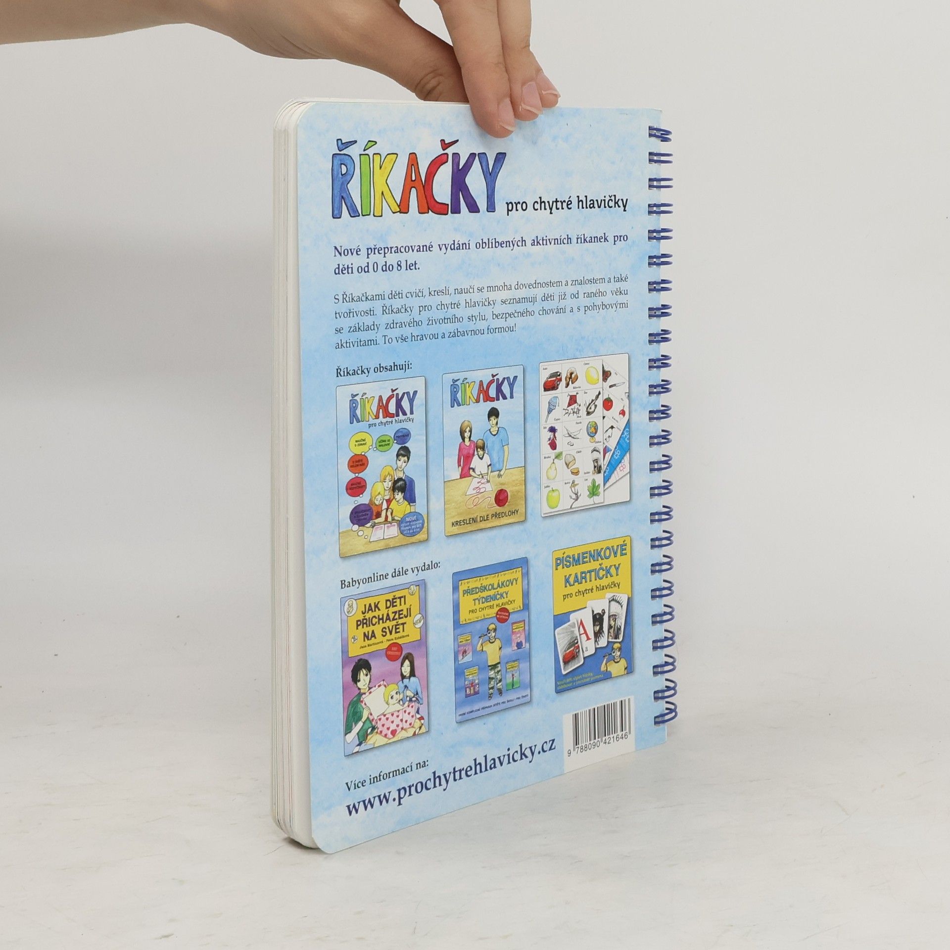 Interaktivní knížka říkanek pro děti od 0 do 8 let s dětmi cvičí, kreslí, učí je zdravému životnímu stylu, bezpečnému chování, o světě kolem nás. Knížka je praktická s kroužkovou vazbou. Komplet obsahuje hlavní publikaci, kreslení dle předlohy a 4 pexesové sady.
