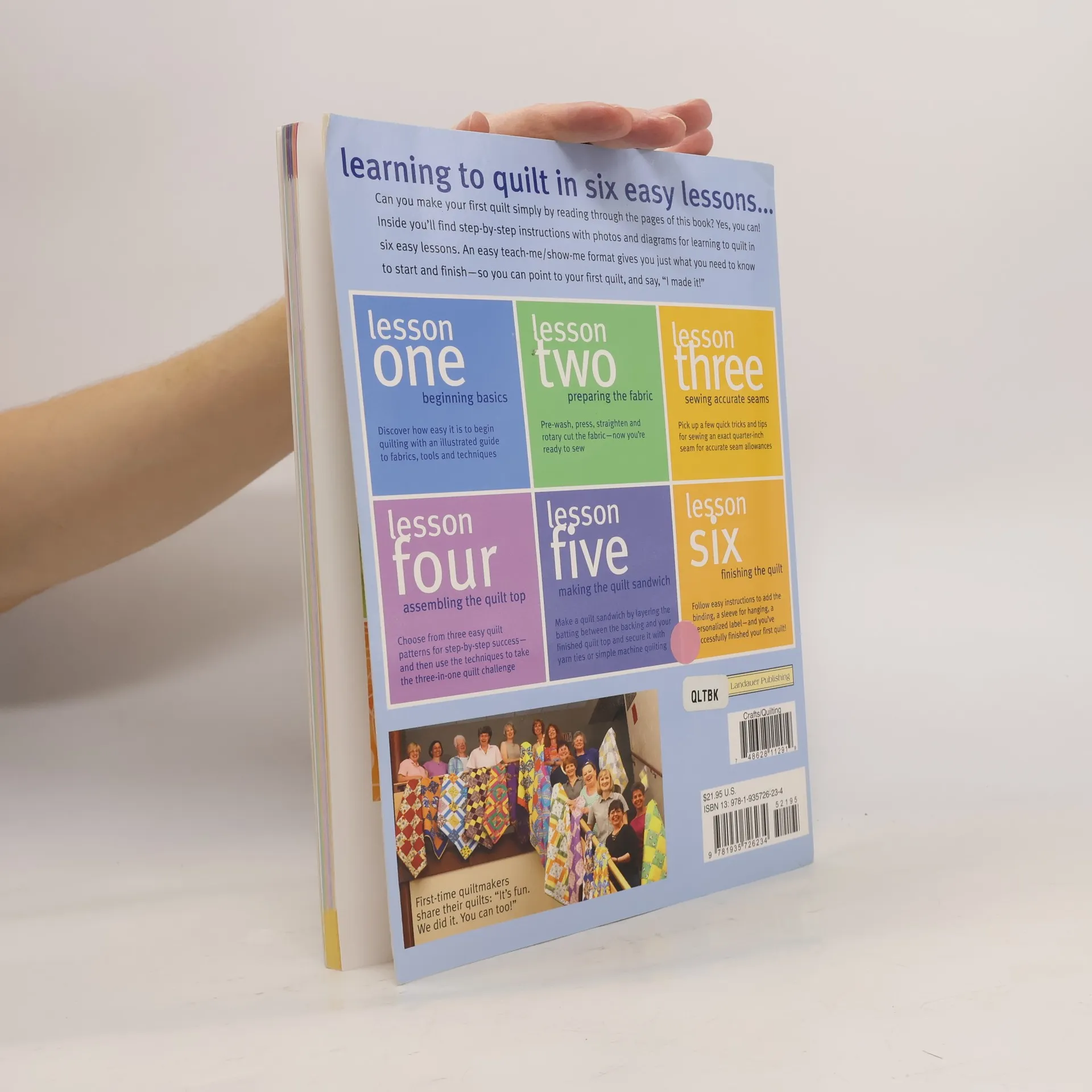 Discover how easy it is to begin quilting with an illustrated guide to fabrics, tools and techniques. Perfect for the first-time quilter, First-Time Quiltmaking is also a great guide for introductory quilting classes. Includes instruction on rotary cutting, sewing accurate seams, piecing basic blocks, and assembling and finishing the quilt top. Includes instructions to add the binding, a sleeve for hanging, and a personalized label.