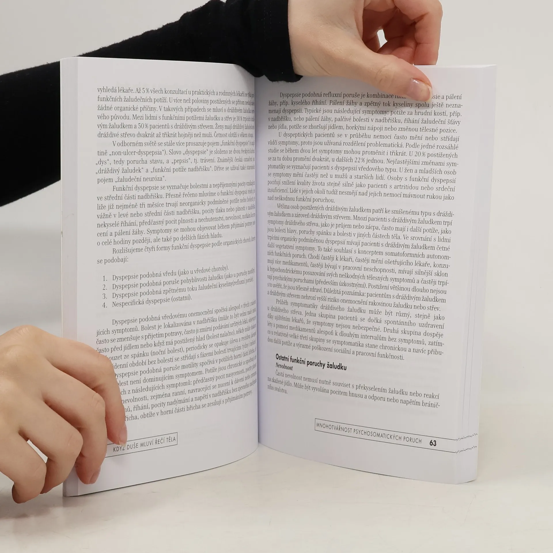 Populární a přitom seriózní přehled psychosomatiky zahrnuje všechny důležité orgány a jejich nejčastější psychosomatická onemocnění. Po krátkém úvodu, který se zabývá dějinami a vymezením psychosomatiky, se autoři soustřeďují na tělesné poruchy bez zjevných organických příčin (somatoformní a disociativní poruchy) a na tělesné poruchy s psychologickými faktory (psychosomatické poruchy v užším smyslu). Popisují řadu somatoformních a psychosomatických poruch podle různých orgánových oblastí - srdce, krevní tlak, dýchání, žaludek, střeva, kůže, ženské orgány, uši, krk, nos, hlas, oči, zuby, pohybové ústrojí. Součástí každé kapitoly jsou kromě kazuistické demonstrace také psychosomatické koncepty, dotýkající se jak psychologických faktorů dané oblasti, tak praktických terapeutických postupů. Také jako e-kniha