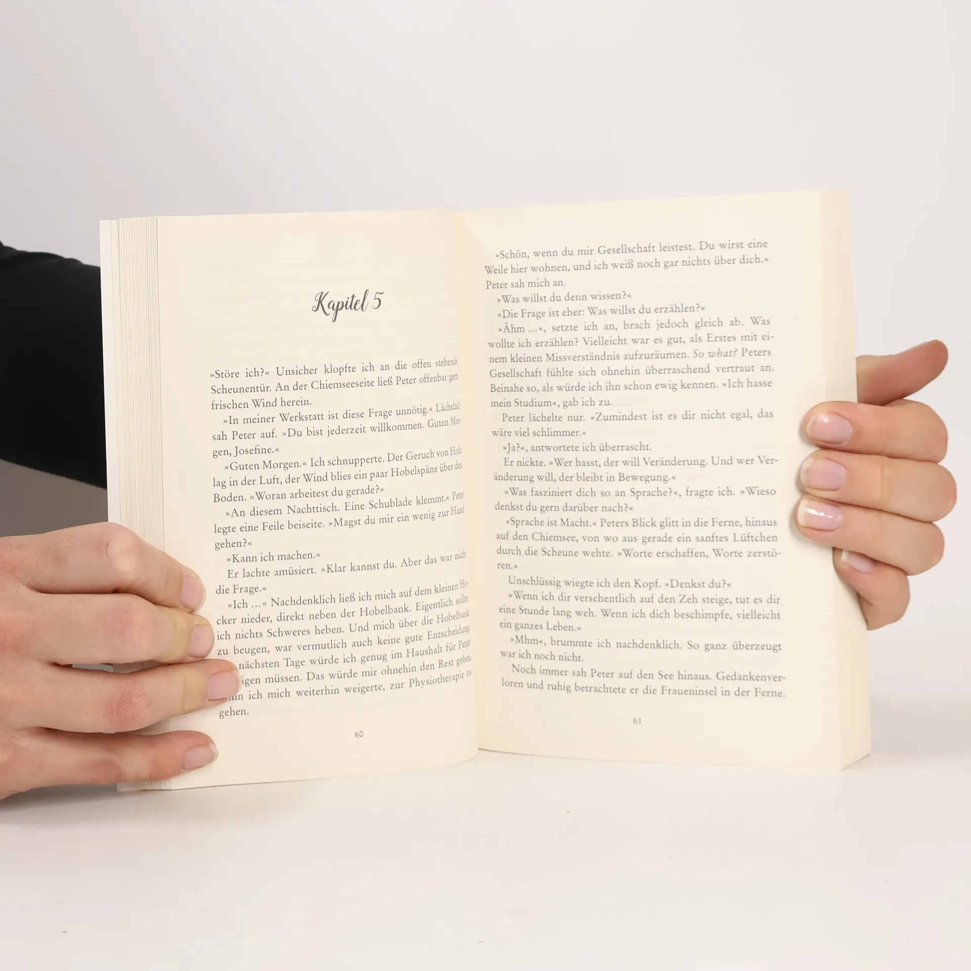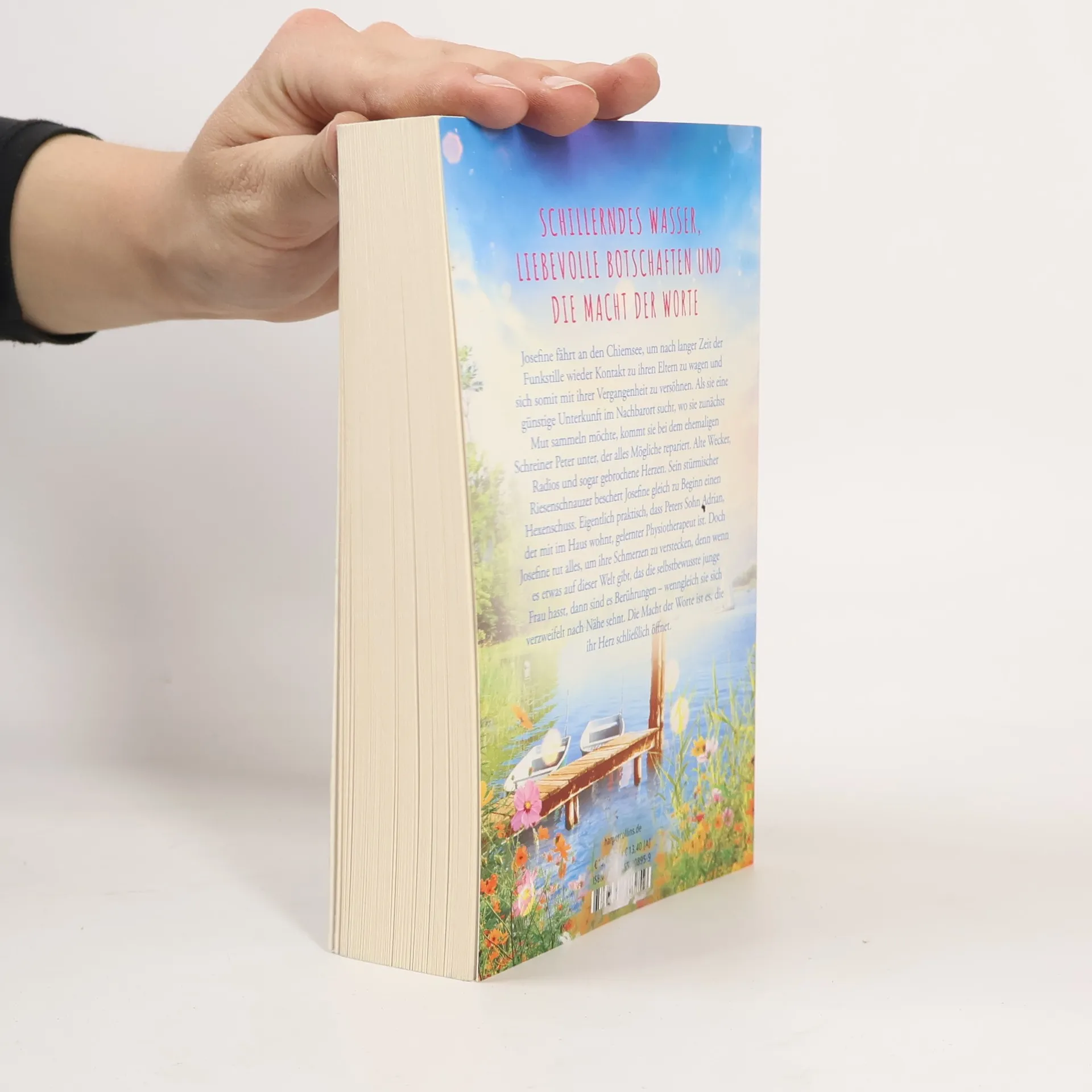 Schillerndes Wasser, liebevolle Botschaften und die Macht der Worte Josefine fährt an den Chiemsee, um sich ihrer Vergangenheit zu stellen und nach langer Zeit der Funkstille Kontakt zu ihren Eltern zu wagen. Als sie eine günstige Unterkunft im Nachbarort sucht, wo sie zunächst Mut sammeln möchte, kommt sie bei dem ehemaligen Schreiner Peter unter, der alles Mögliche repariert. Alte Wecker, Radios, und sogar gebrochene Herzen. Sein unerzogener, stürmischer Riesenschnauzer beschert Josefine gleich zu Beginn einen Hexenschuss. Eigentlich praktisch, dass Peters Sohn Adrian, der mit im Haus wohnt, gelernter Physiotherapeut ist. Doch Josefine tut alles, um ihre Schmerzen zu verstecken, denn wenn es etwas auf dieser Welt gibt, das die selbstbewusste junge Frau hasst, dann sind es Berührungen – wenngleich sie sich verzweifelt nach Nähe sehnt. Die Macht der Worte ist es, die ihr Herz schließlich öffnet.