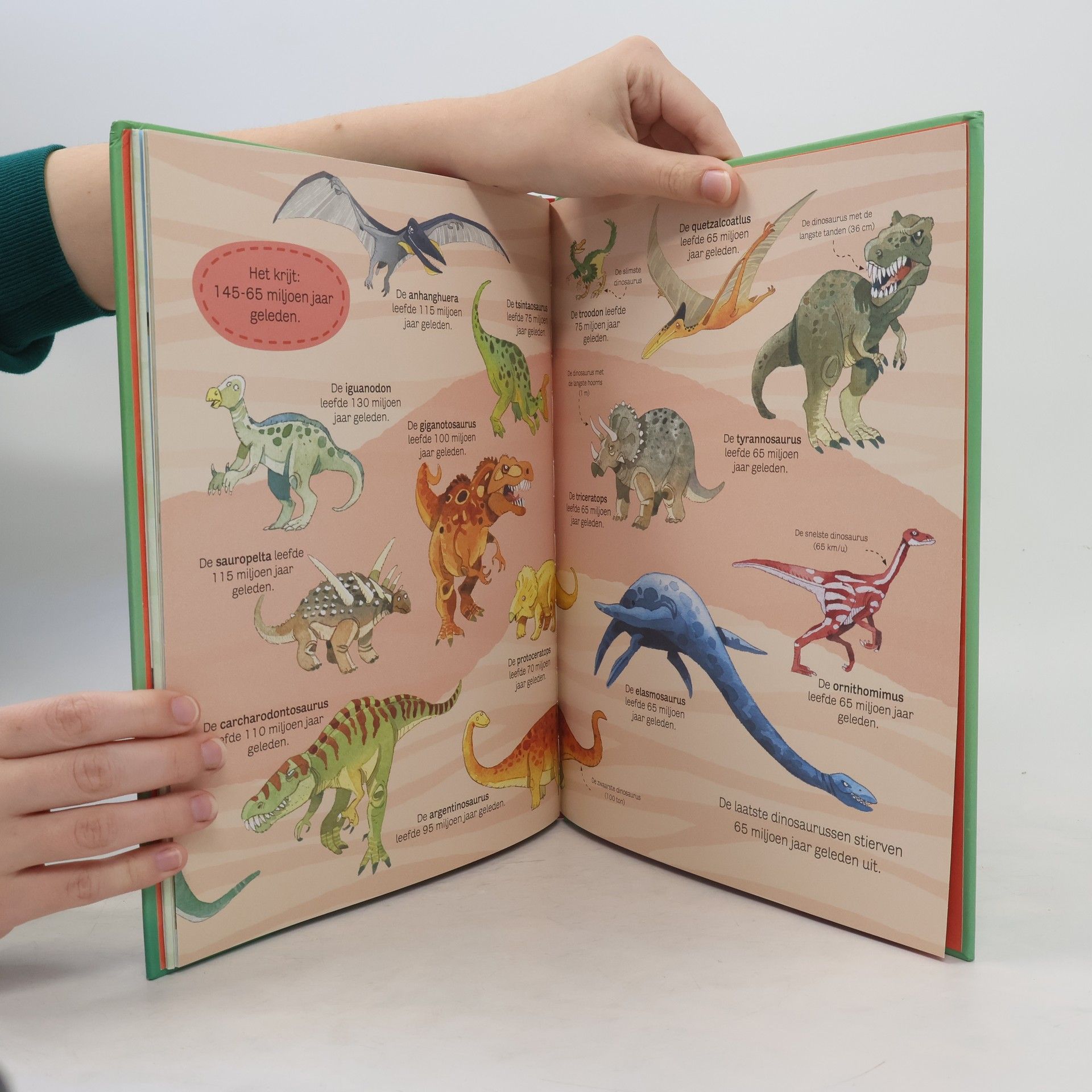 Overzicht van de grootste, zwaarste en meest angstaanjagende dinosauriërs. Hardkartonnen uitgave met kleurentekeningen en uitvouwbare pagina's. Vanaf ca. 8 t/m 10 jaar.
