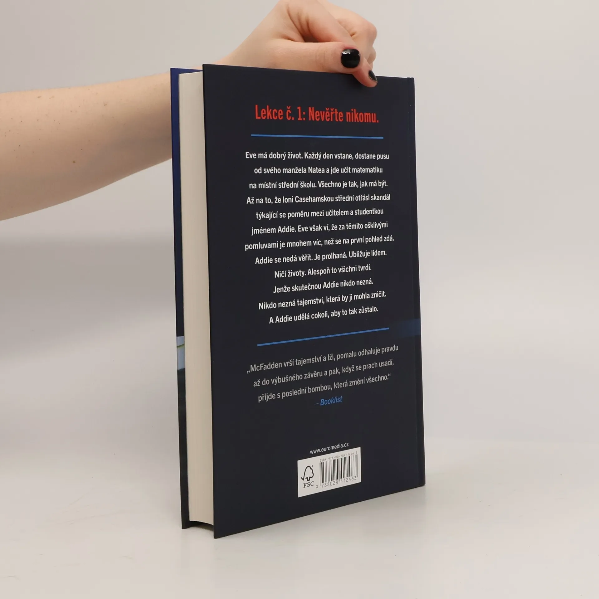 Eve má dobrý život. Každý den vstane, dostane pusu od svého manžela Natea a jde učit matematiku na místní střední školu. Všechno je tak, jak má být. Až na to, že loni casehamskou střední otřásl skandál týkající se poměru mezi učitelem a studentkou jménem Addie. Eve však ví, že za těmito ošklivými pomluvami je mnohem víc, než se na první pohled zdá. Addie se nedá věřit. Je prolhaná. Ubližuje lidem. Ničí životy. Alespoň to všichni tvrdí. Jenže skutečnou Addie nikdo nezná. Nikdo nezná tajemství, která by ji mohla zničit. A Addie udělá cokoli, aby to tak zůstalo.